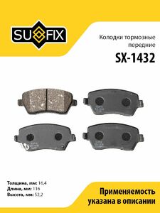 Колодки тормозные передние SUFIX SX-1432. Применение: SUZUKI Splash 08> / Swift III 05>, OPEL Agila B 08>. ОЕ: 93192962; 93196814; 4708239; 4711040; 55810-62J00; 55810-62J10; 55810-62J20; 55810-62J31; 55810-62J50.