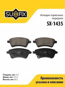 Колодки тормозные передние SUFIX SX-1435. Применение: SUZUKI SX4 1.5, 1.6 06/06-> Front. ОЕ: 71742853; 71750033; 5581079J00; 5581079J00000; 5581079J10 .