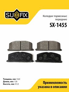 Колодки тормозные передние SUFIX SX-1455. Применение: TOYOTA Camry >92/Carina II (13") >92/Celica >90/Corolla >92/Starlet >92. ОЕ: 049112281; 94855748; 0446510040; 0446512010; 0446512040; 0446512090; 0446512490; 0446516070; 0446517021; 0446517070; 0446520030; 0446520080; 0446520180; 0446520270; 0446520300; 0446521010; 04465YZZAA; 0449102010; 0449110160; 0449110161; 0449110220; 0449110221; 0449112170; 0449112230; 0449112231; 0449112232; 0449112240; 0449112241; 0449112250; 0449112290; 0449112300; 0449112320; 0449112321; 0449112322; 0449112323; 0449112330; 0449112331; 0449112401; 0449112421; 0449112422; 0449112432; 0449112461; 0449112510; 0449112540; 0449112541; 0449116040; 0449116041; 0449116081; 0449116110; 0449116210; 0449116211; 0449117030; 0449117040; 0449117050; 0449117060; 0449117061; 0449117070; 0449117080; 0449117130; 0449120170; 0449120191; 0449120202; 0449120220; 0449120221; 0449120271; 0449120310; 0449120311; 0449120320; 0449120321; 0449120380; 0449120450; 0449120461; 0449120470; 0449120471; 0449120501; 0449120521; 0449120610; 0449120620; 0449120820; 0449132020; 0449132030; 0449132031; 0449132080; 0449132081; 0449132180; 0449150060 .