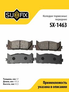 Колодки тормозные передние SUFIX SX-1463. Применение: TOYOTA Camry(V40) 06>, LEXUS ES350 07>. ОЕ: 0446506070; 0446506080; 0446506131; 0446533440; 0446533445; 0446533450; 0446533470; 0446533471 .