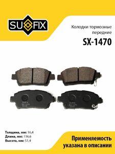 Колодки тормозные передние SUFIX SX-1470. Применение: TOYOTA Corolla(E120) JAP 99> / Yaris(P10) 99-06/Yaris Verso(P21/P22) 99-05/Prius 00> / MR2 00>. ОЕ: 044650W080; 0446512581; 0446517100; 0446517101; 0446517140; 0446520480; 0446547030; 0446552010; 0446552011; 0446552021; 0446552022; 0446552060; 0446552120; 0446552170 .