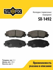 Колодки тормозные передние SUFIX SX-1492. Применение: TOYOTA RAV 4 2.0-2.2D 06> / Auris(E150) 1.8 10>. ОЕ: 04465-02230; 04465-42140; 04465-42150; 04465-42180; 04465-42190.