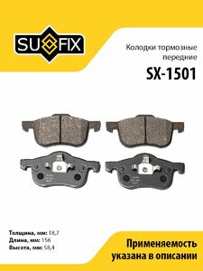 Колодки тормозные передние SUFIX SX-1501. Применение: VOLVO S60 2.0-2.5T 00> / S80 2.0-3.0T 98-06 / XC70 2.4D-2.5T 02>. ОЕ: 30648385; 30648387; 86238615; 86349210.
