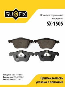 Колодки тормозные передние SUFIX SX-1505. Применение: VOVLO S60 2.0-2.5T 00-10 / S80 2.4-2.4D 99-06 / XC90 2.4D-4.4 02>. ОЕ: 274285; 2742856; 30793265; 30769122; 30793231; 307932650.