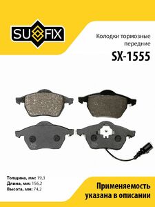 Колодки тормозные передние SUFIX SX-1555. Применение: AUDI A3 1.8 T 98>, SKODA Octavia 1.8 T 97>, VW Bora/Golf 1.8-2.3 98-05. ОЕ: 1J0698151K; 1J0698151M; 8N0698151A; 8N0698151C .