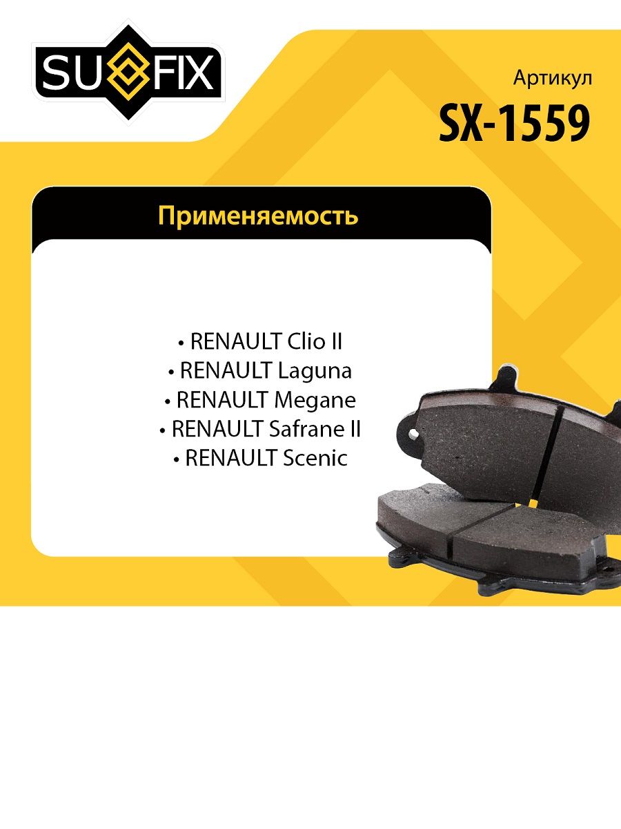 Колодки тормозные передние SUFIX SX-1559. Применение: RENAULT Clio II 98-09 / Laguna 93-01 / Megane 96-03 / Megane Scenic 96-99 / Safrane II 96-00 / Scenic 99-03. ОЕ: 410604441R; 410607125R; 7701206379; 7701209380; 8671005930; 8671016177.