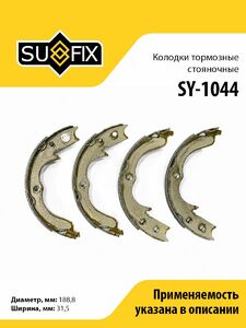 Колодки тормозные стояночные SUFIX SY-1044. Применение: MITSUBISHI Grandis 05> / Lancer(CY/CX) 08> / Outlander/Airtrek II 06>, CITREOEN C-Crosser 07>, PEUGEOT 4007 07>, SUBARU Forester(SH) 08> / Impreza(GH/GE) 08>.