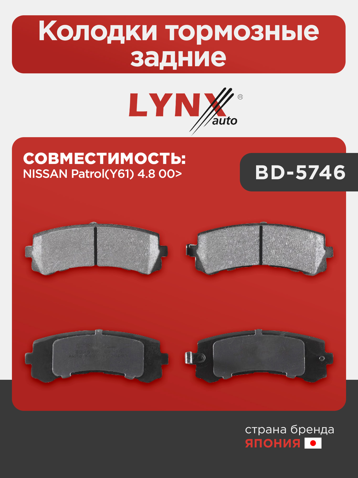 Колодки тормозные задние LYNXauto BD-5746. Для NISSAN Ниссан Patrol(Патрол)(Y61) 4.8 00>