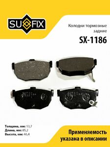 Колодки тормозные задние SUFIX SX-1186. Применение: HYUNDAI Elantra 1.6 00-06, KIA Cerato 1.5D-2.0D 04-08, NISSAN Maxima 3.0 91-94.