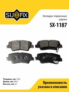 Колодки тормозные задние SUFIX SX-1187. Применение: HYUNDAI Elantra 1.6-1.6D 11> / i30(GD) 1.4-1.6 11> / i40 1.6-2.0 12> / Sonata(NF) 2.0-3.3 05> / Solaris 1.4-1.6 10> / Tucson(JM) 2.0-2.7 04-10, KIA Rio III 1.1D-1.6 11> / Soul 1.6-1.6D 09>.