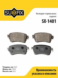 Колодки тормозные задние SUFIX SX-1401. Применение: CITROEN Jumpy 1.5d-2.0d 16> / Spacetourer 1.5d-2.0d 16>, OPEL Vivaro C 1.5d-2.0d 19> / Zafira 1.5d-2.0d 19>, PEUGEOT Expert 1.5d-2.0d 16> / Traveller 1.5d-2.0d 16>, TOYOTA Proace 1.5d-2.0d 16>.