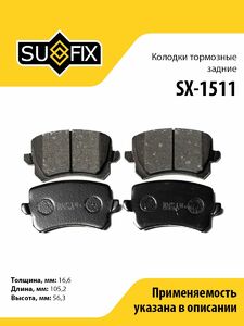 Колодки тормозные задние SUFIX SX-1511. Применение: VW Passat 1.6-3.2 05-10/Tiguan 1.4-2.0 07>, HAVAL F7 / F7X.