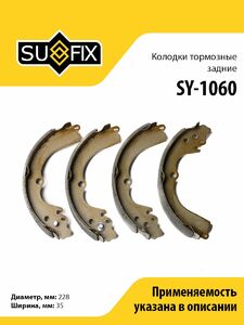 Колодки тормозные задние SUFIX SY-1060. Применение: SUBARU Forester(SF/SG) 2.0-2.5 97> / Impreza 1.6-2.0 95-00 / Legacy I-II 1.8-2.2 >98.