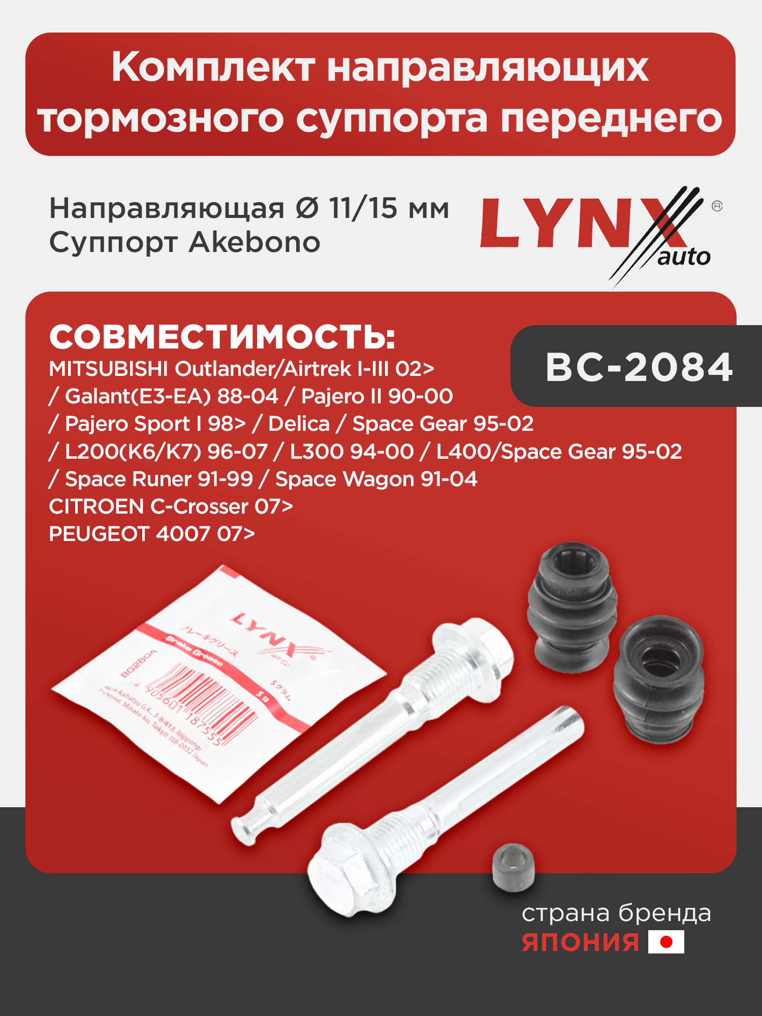 Комплект направляющих тормозного суппорта переднего (направляющая Ø 11/15mm, суппорт Akebono) LYNXauto BC-2084. Для: Mitsubishi, Митсубиси, Outlander(Аутлэндер)/Airtrek I-III 02> / Galant(Галант)