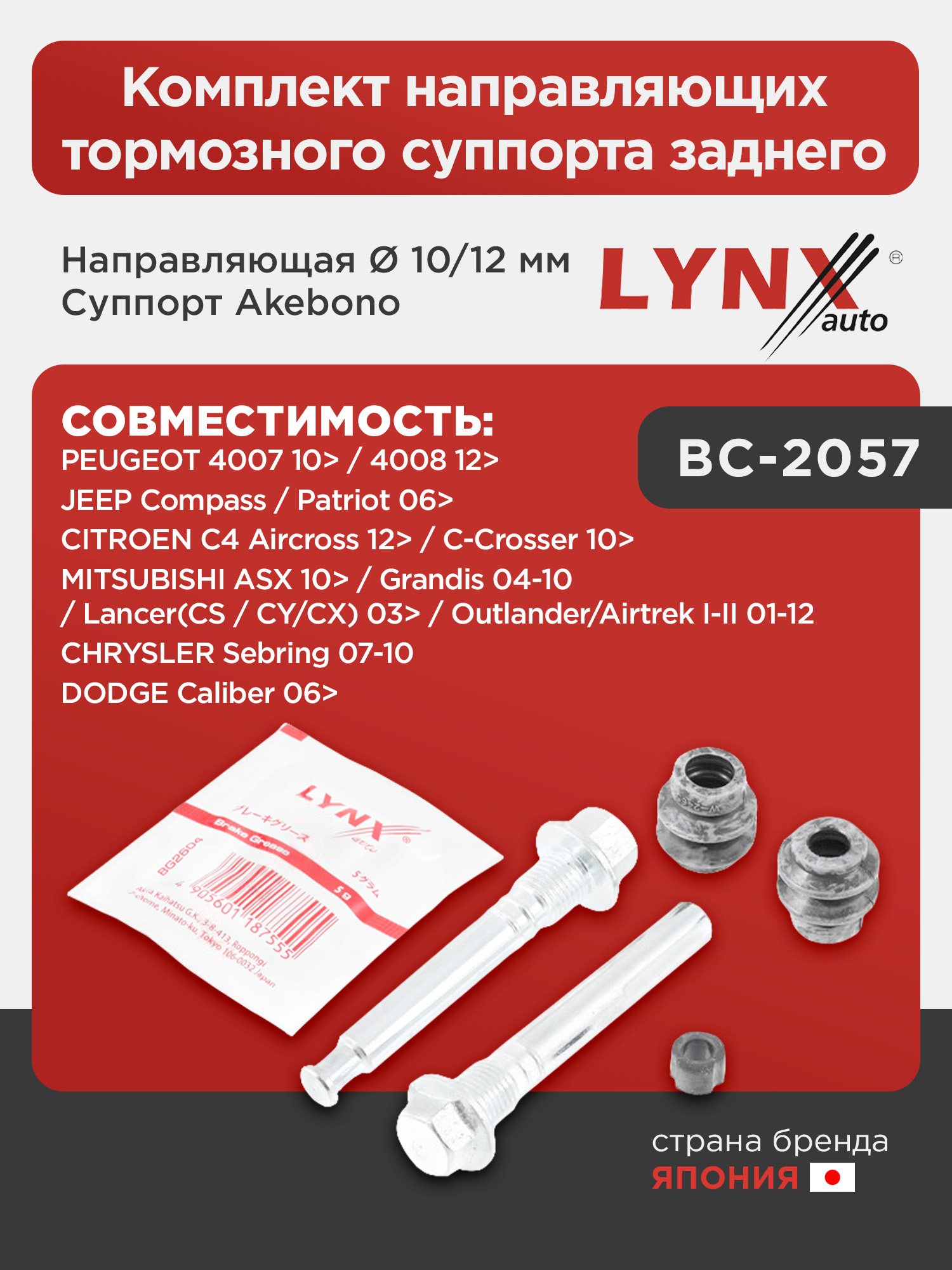Комплект направляющих тормозного суппорта заднего (направляющая Ø 10/12mm, суппорт Akebono) LYNXauto BC-2057. Применение: MITSUBISHI ASX 10> / Grandis 04-10 / Lancer(CS / CY/CX) 03> / Outlander/Airtrek I-II 01-12, CHRYSLER Sebring 07-10, CITROEN C4 Aircross 12> / C-Crosser 10>, DODGE Caliber 06>, JEEP Compass / Patriot 06>, PEUGEOT 4007 10> / 4008 12>