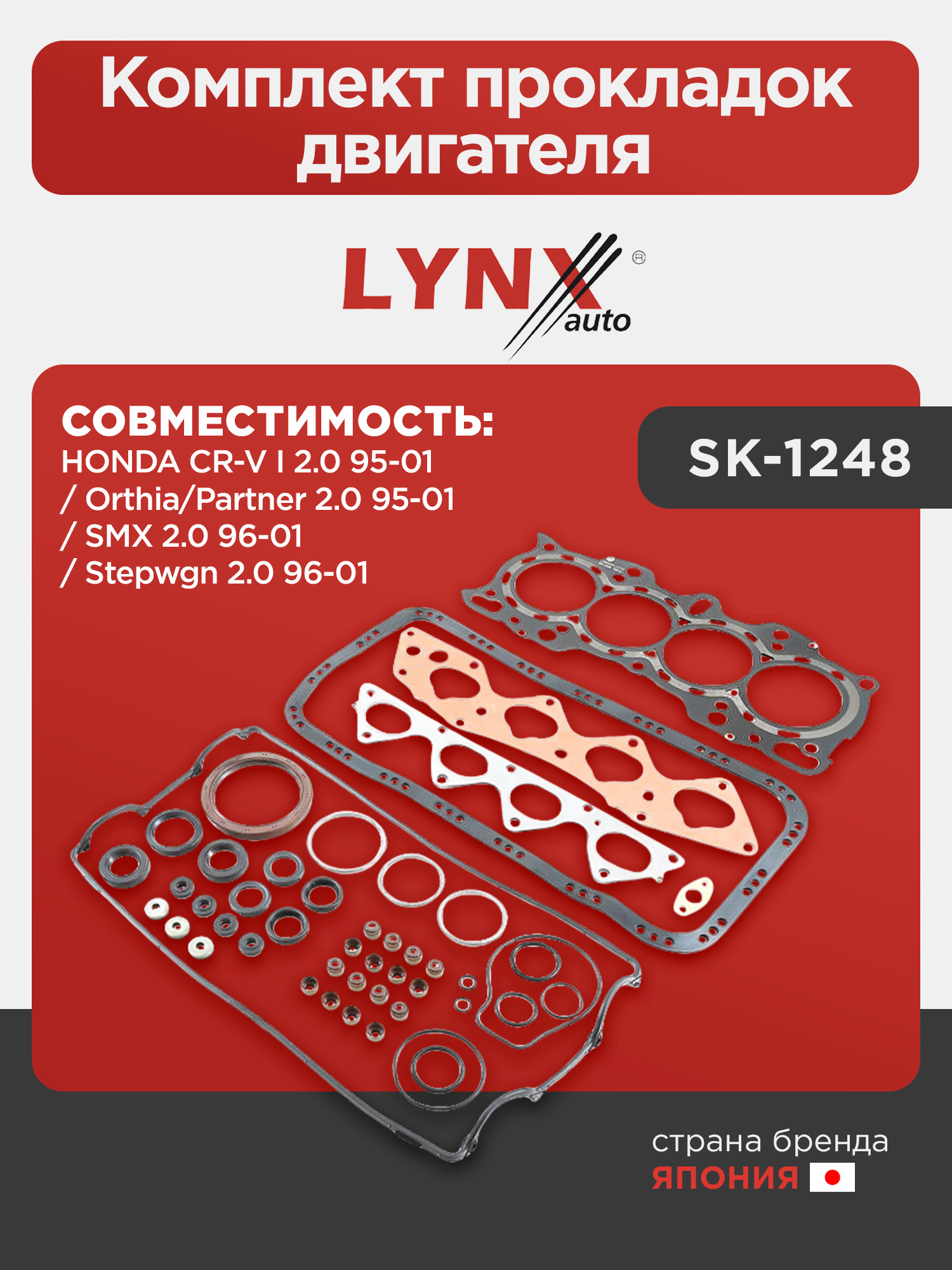 Комплект прокладок двигателя LYNXauto SK-1248. Для: HONDA Хонда CR-V(Сиэрви) I 2.0 95-01 / Orthia/Partner 2.0 95-01 / SMX 2.0 96-01 / Stepwgn 2.0 96-01