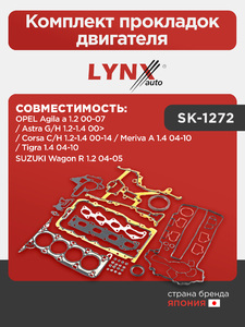 Комплект прокладок двигателя LYNXauto SK-1272. Применение: OPEL Agila a 1.2 00-07 / Astra G/H 1.2-1.4 00> / Corsa C/H 1.2-1.4 00-14 / Meriva A 1.4 04-10 / Tigra 1.4 04-10, SUZUKI Wagon R 1.2 04-05.