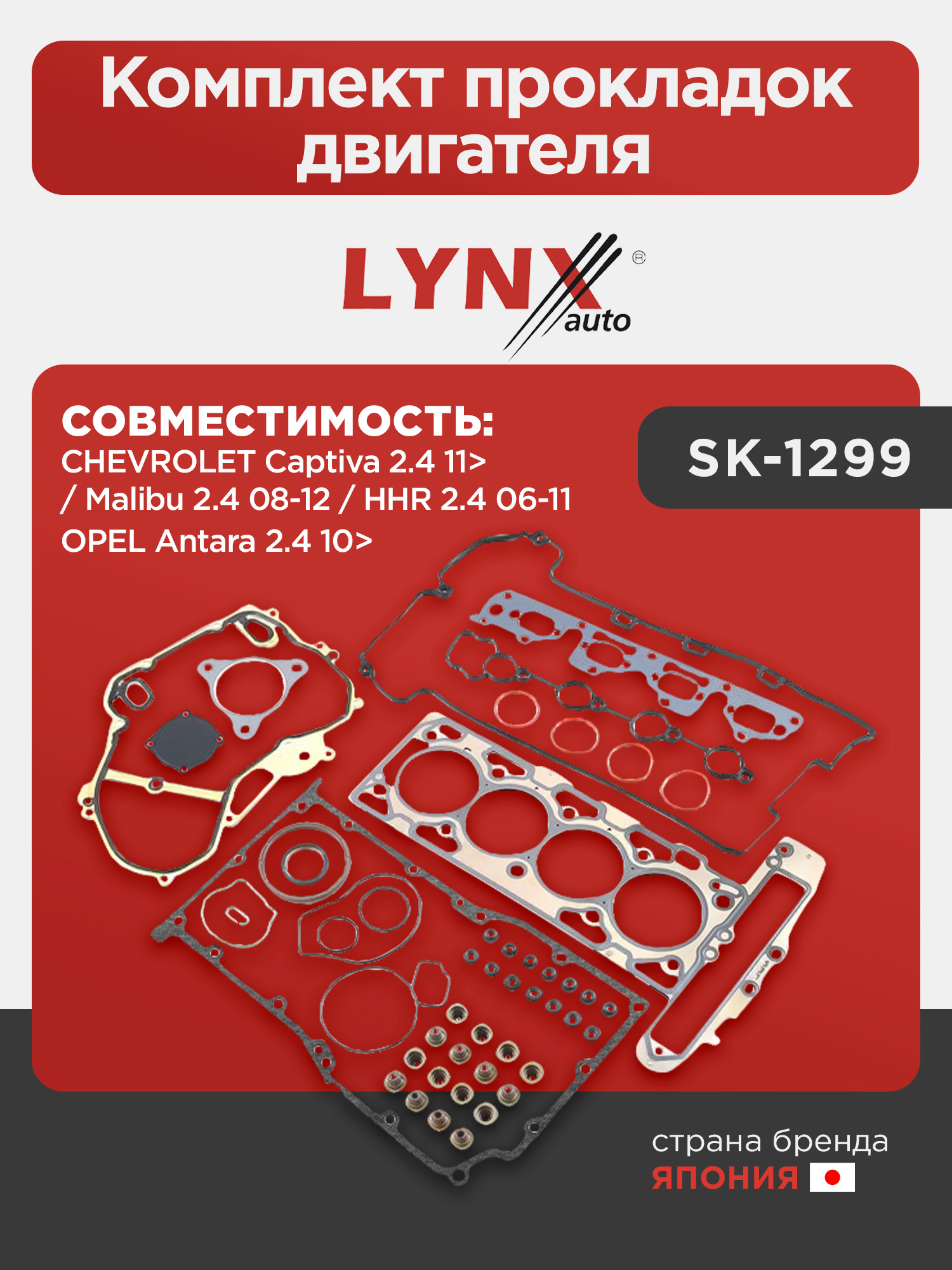 Комплект прокладок двигателя LYNXauto SK-1299. Для: CHEVROLET Шевроле Captiva(Каптива) 2.4 11> / Malibu 2.4 08-12 / HHR 2.4 06-11, OPEL Опель Antara(Антара) 2.4 10>
