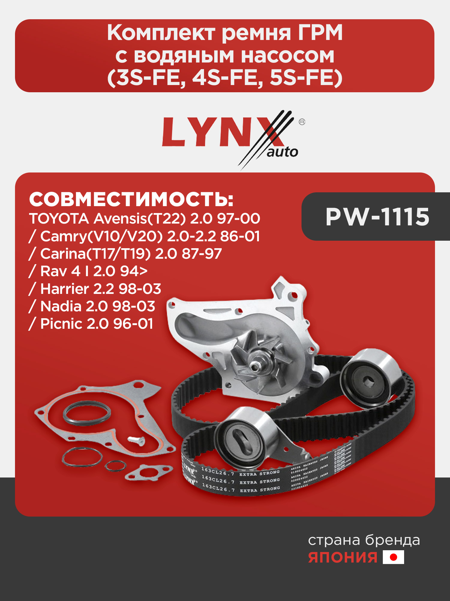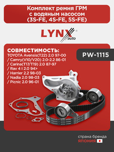 Комплект ремня ГРМ с водяным насосом (3S-FE, 4S-FE, 5S-FE) LYNXauto PW-1115. Для TOYOTA Avensis(T22) 2.0 97-00 / Camry(V10/V20) 2.0-2.2 86-01 / Carina(T17/T19) 2.0 87-97 / Rav 4 I 2.0 94> / Harrier 2.2 98-03 / Nadia 2.0 98-03 / Picnic 2.0 96-01