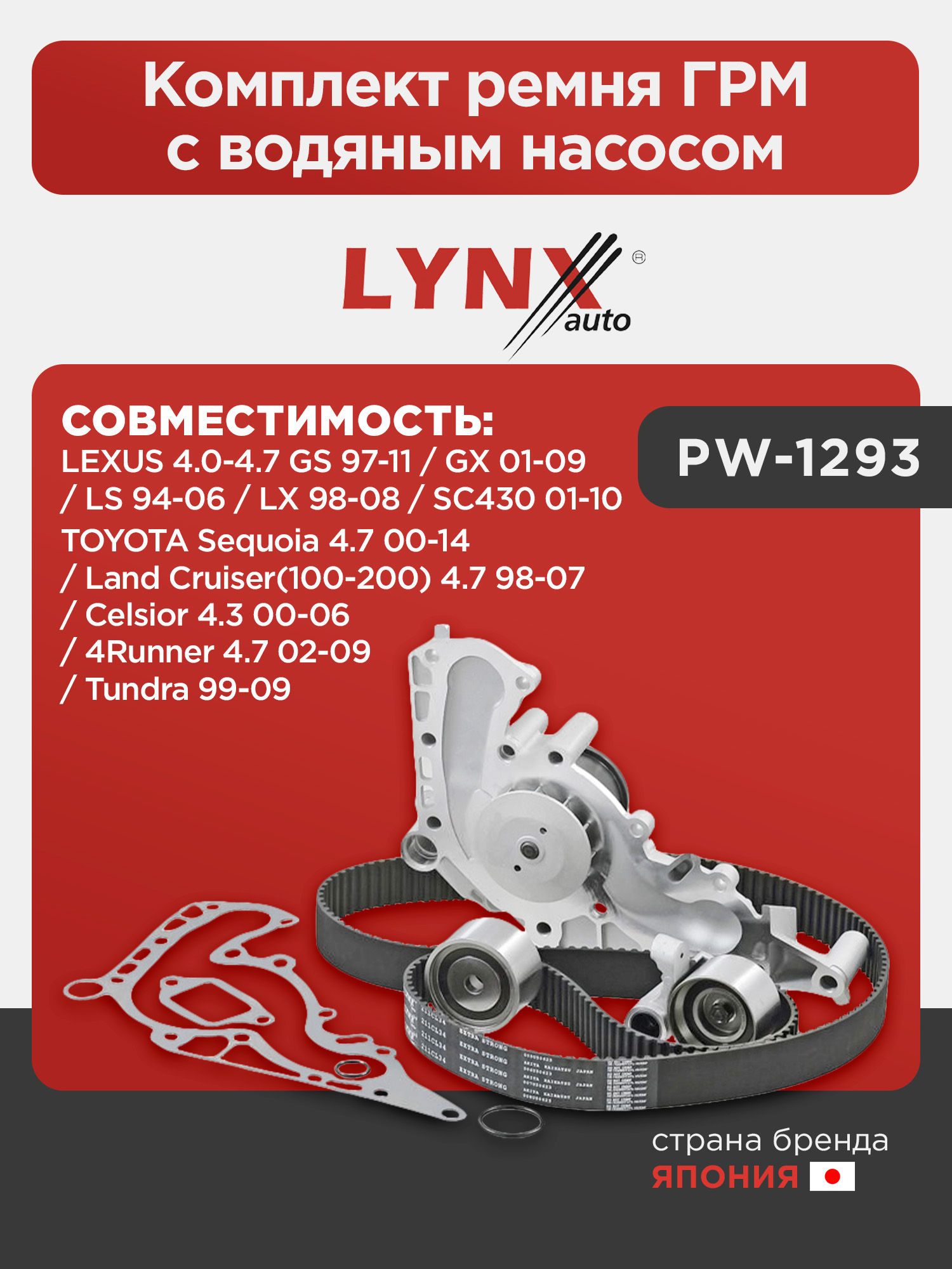 Комплект ремня ГРМ с водяным насосом LYNXauto PW-1293. Для: LEXUS ЛЕКСУС 4.0-4.7 GS 97-11 / GX 01-09 / LS 94-06 / LX 98-08 / SC430 01-10, TOYOTA Тойота Sequoia(Секвоя) 4.7 00-14 / Land Cruiser(Ленд Крузер)(100-200) 4.7 98-07 / Celsior 4.3 00-06 / 4Runner