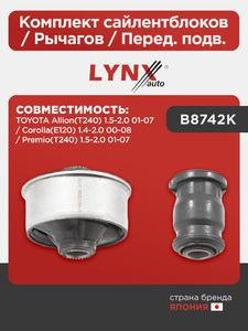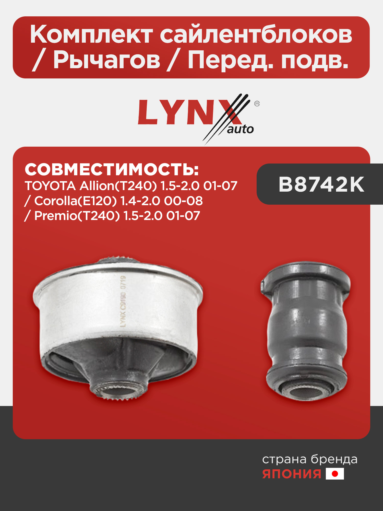 Комплект сайлентблоков / Рычагов / Перед. подв. LYNXauto B8742K. Для TOYOTA Allion(T240) 1.5-2.0 01-07 / Corolla(E120) 1.4-2.0 00-08 / Premio(T240) 1.5-2.0 01-07