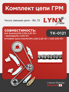 Комплект цепи ГРМ LYNXauto TK-0121. Применение: HYUNDAI Santa Fe(CM/DM) 2.0D-2.2D 10> / ix35 2.0D 10>, KIA Sorento(XM) 2.0D-2.2D 10> / Sportage(SL) 2.0D 10>. Число звеньев цепи- 90, 72.