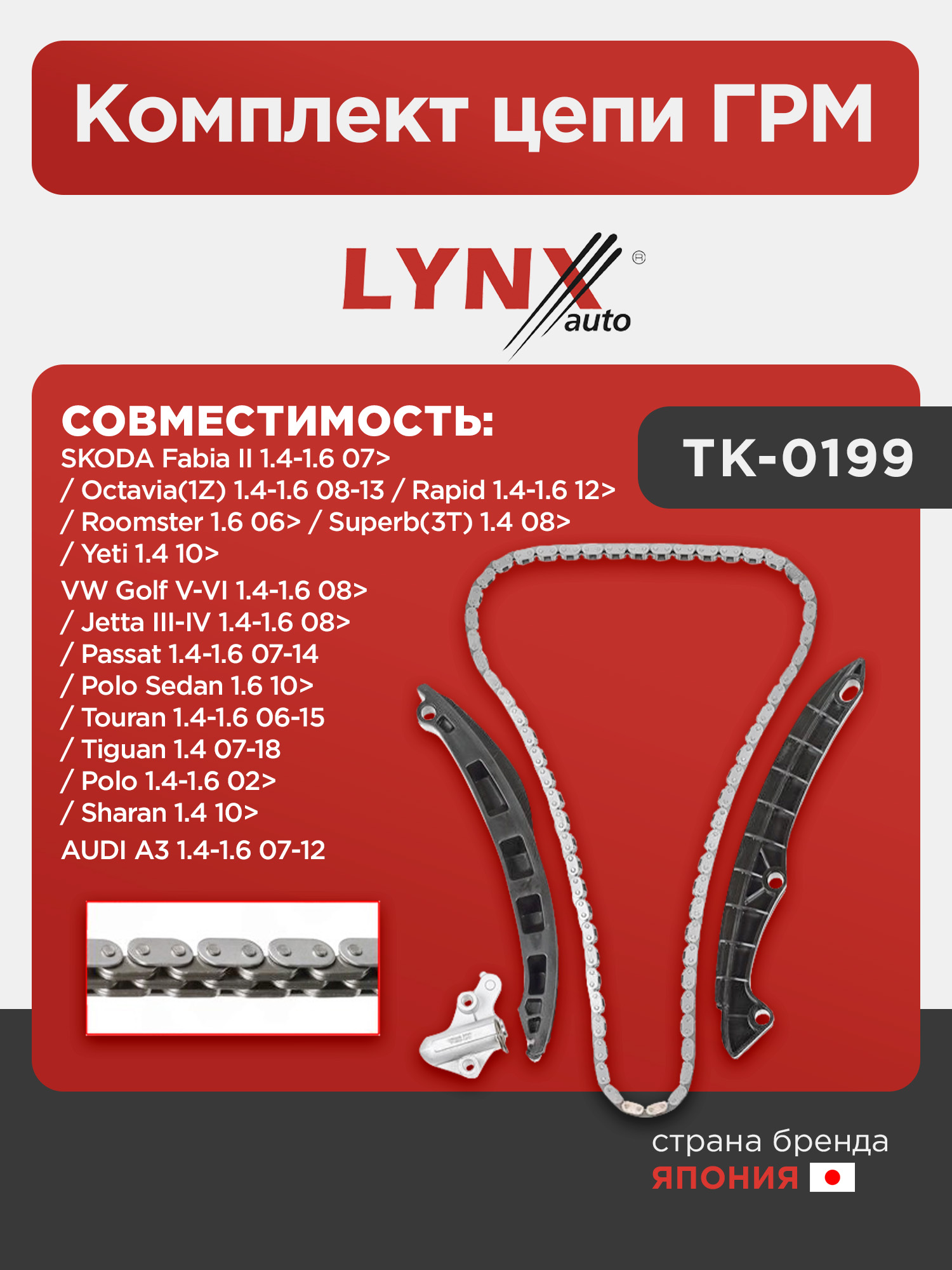 Комплект цепи ГРМ LYNXauto TK-0199. Применение: AUDI A3 1.4-1.6 07-12, SKODA Fabia II 1.4-1.6 07> / Octavia(1Z) 1.4-1.6 08-13 / Rapid 1.4-1.6 12> / Roomster 1.6 06> / Superb(3T) 1.4 08> / Yeti 1.4 10>, VW Golf V-VI 1.4-1.6 08> / Jetta III-IV 1.4-1.6 08> / Passat 1.4-1.6 07-14 / Polo 1.4-1.6 02> / Polo Sedan 1.6 10> / Sharan 1.4 10> / Tiguan 1.4 07-18 / Touran 1.4-1.6 06-15.