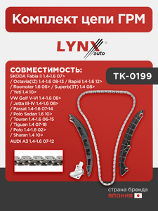 Комплект цепи ГРМ LYNXauto TK-0199. Для: Audi, Ауди A3 1.4-1.6 07-12, Skoda, Шкода, Fabia(Фабия) II 1.4-1.6 07> / Octavia(Октавия)(1Z) 1.4-1.6 08-13 / Rapid(Рапид) 1.4-1.6 12> / Roomster(Румстер) 1.6.