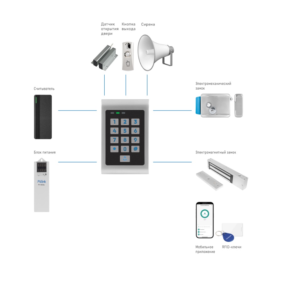 до 10000 RFID-ключей (карт!!!)/паролей до 500 пользователей в приложении |