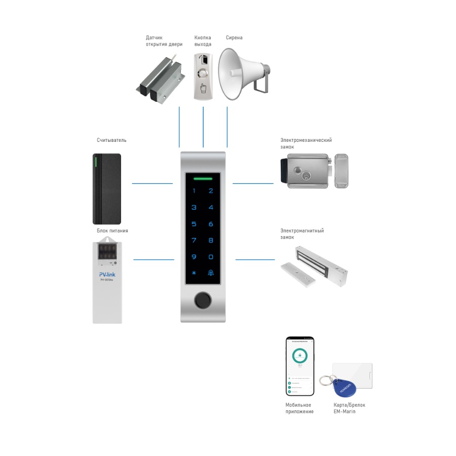 - Встроенные считыватели Em-Marin и отпечатков;