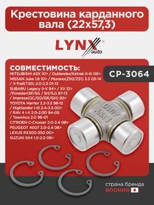 Крестовина карданного вала (22x57,3) LYNXauto CP-3064. Для: Mitsubishi, Митсубиси, ASX 10> / Outlander(Аутлэндер)/Airtrek II-III 06>, Lexus, Лексус, RX300-350 00>, Nissan, Ниссан, Juke(Жук) 1.6 10>.