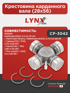Крестовина карданного вала (28x56) LYNXauto CP-3042. Для: NISSAN Pathfinder(R50) 3.3-3.5 97-04 / Patrol(Y60 / Y61) 2.8D-4.2D 88> / Pick Up(D21 / D22) 2.4-3.2D 86> / Pathfinder / Terrano/Pathfinder(WD21) 2.7D-3.0 86-95 / Cabstar(F22 / F23) 2.7D-3.0D 83>