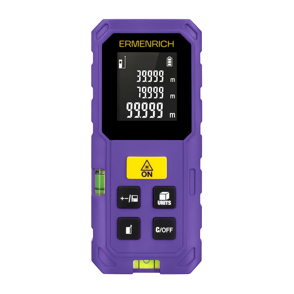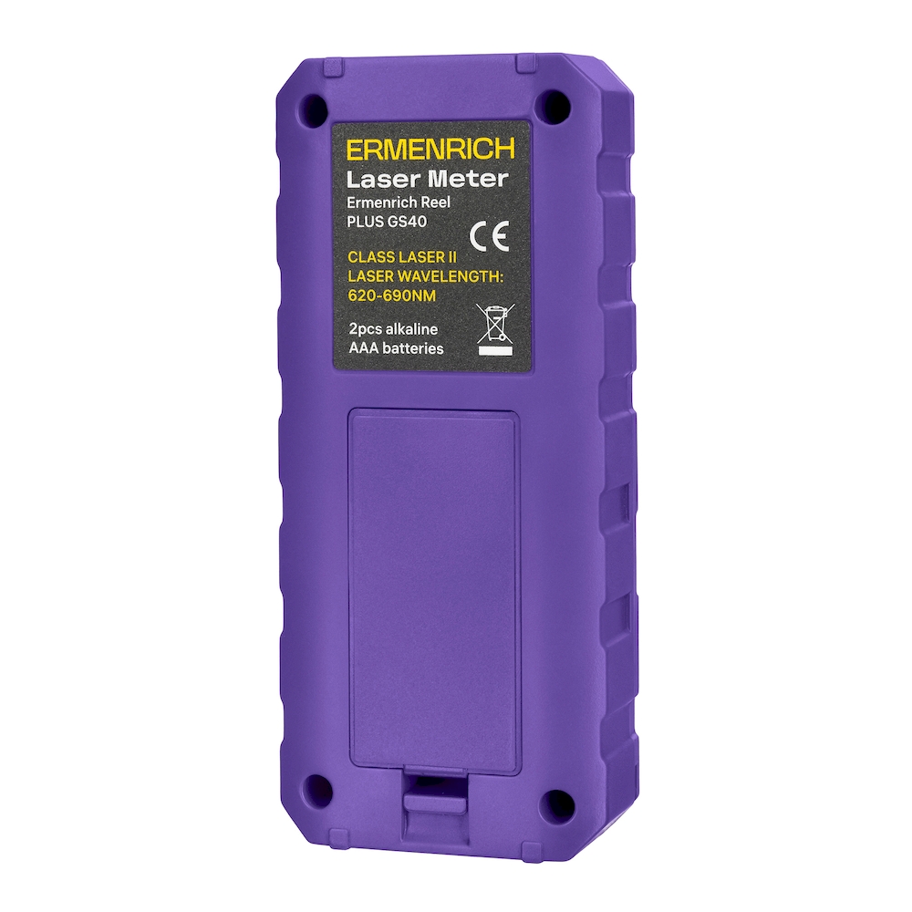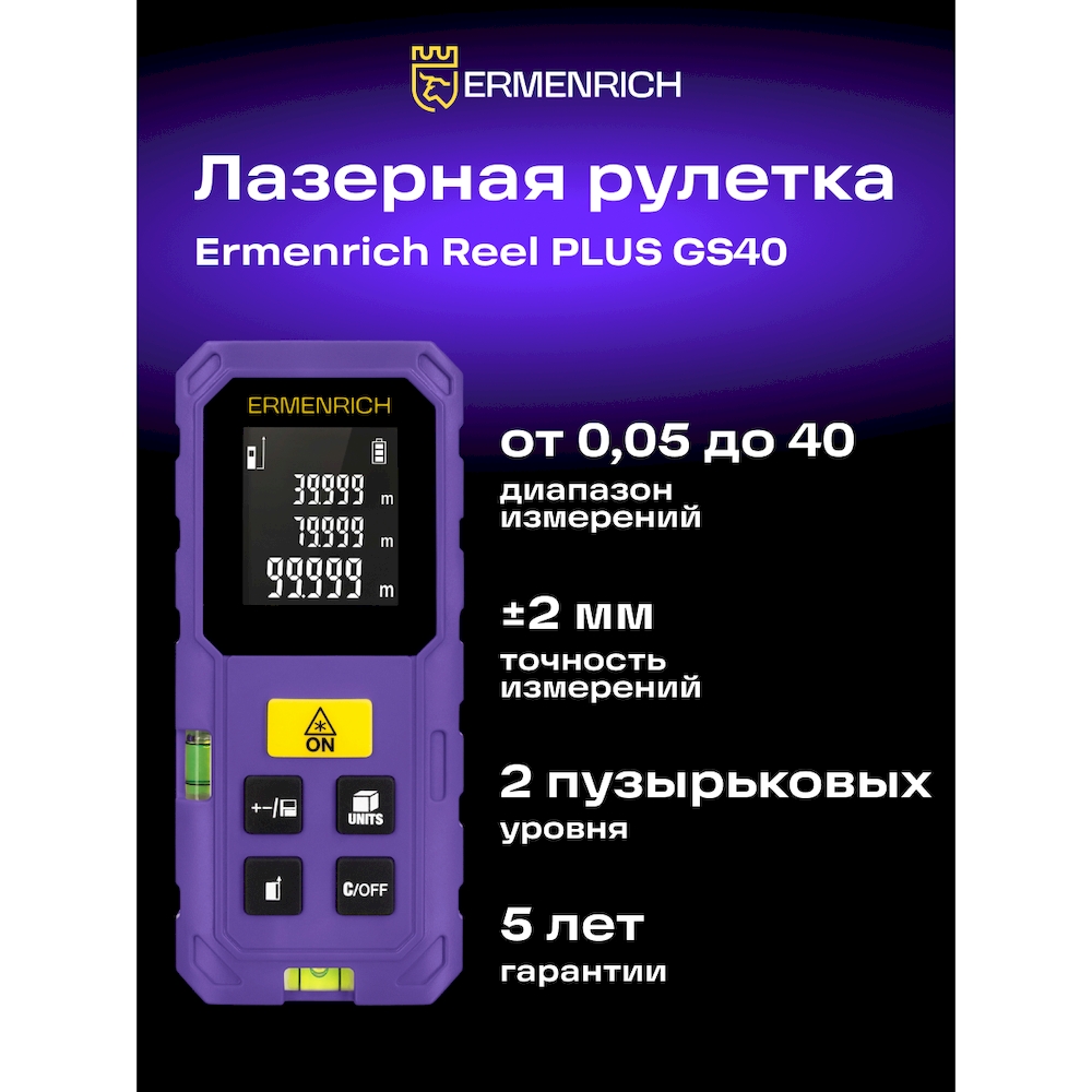 Лазерная рулетка Ermenrich Reel PLUS GS40 — это компактный и практичный измерительный инструмент для бытового и полупрофессионального использования. Она предназначена для выполнения основных задач: измерения расстояний, расчёта площадей и объёмов, а также сложения и вычитания результатов. Прибор поддерживает три режима работы: однократный замер, непрерывное сканирование пространства и суммирование показаний между несколькими точками. Диапазон измерений — от 5 см до 40 м с точностью ±2 мм. Пользователь может выбрать удобные единицы измерения: метры, футы или дюймы. Результаты сохраняются во встроенной памяти (до 20 групп).