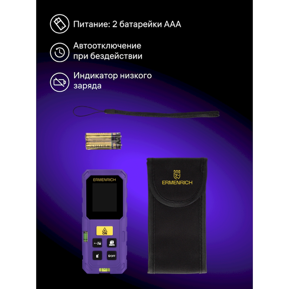 Устройство оснащено безопасным лазером класса 1 (длина волны 620–690 нм, мощность менее 1 мВт) с красным лучом для точного наведения. На корпусе расположены два горизонтальных пузырьковых уровня, которые помогают правильно ориентировать прибор при измерениях или использовать его как самостоятельный строительный уровень. Управление осуществляется с помощью нескольких кнопок, а данные выводятся на трёхстрочный монохромный дисплей. Питание обеспечивается двумя батарейками типа AAA (в комплект не входят), заряда которых хватает более чем на 5000 измерений. Для экономии энергии предусмотрена функция автоотключения: лазер отключается через 30 секунд бездействия, а весь прибор — через 180 секунд. Также имеется звуковой сигнал (зуммер) и индикатор низкого заряда батареи. Рулетка работает в температурном диапазоне от 0 до +40 °C и подходит для универсального применения в быту и на небольших строительных объектах.