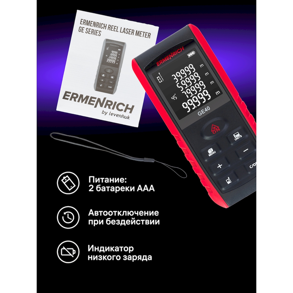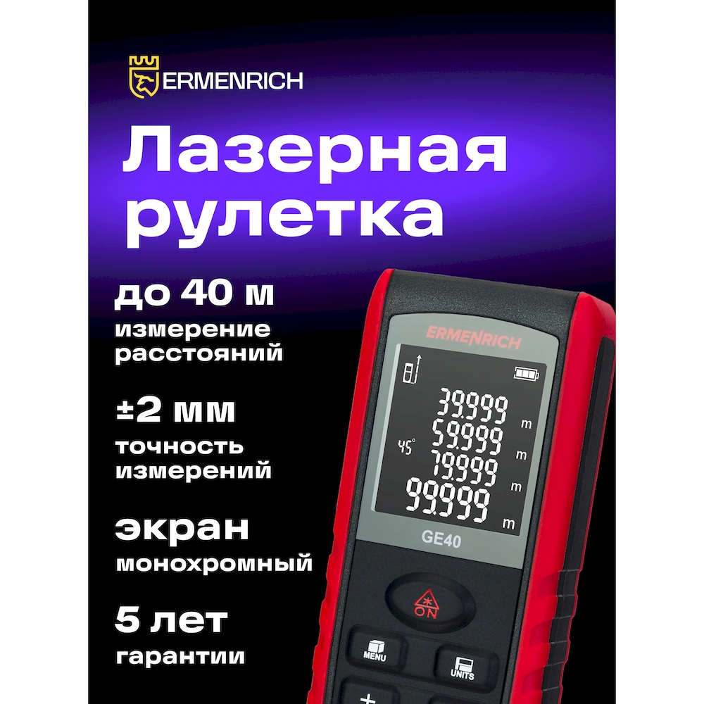 Лазерная рулетка Ermenrich Reel PRO GE40 — это точный и функциональный измерительный инструмент, прошедший поверку и внесённый в Государственный реестр средств измерений (ГРСИ). Она предназначена не только для измерения прямых расстояний, но и для расчёта углов, площадей и объёмов, что делает её незаменимой при выполнении ремонтных, строительных и проектных работ. Прибор оснащён красным лазерным лучом класса 1 (длина волны 620–690 нм, мощность менее 1 мВт), обеспечивающим безопасность и точность. Диапазон измерений составляет от 5 см до 40 м с погрешностью всего ±2 мм.