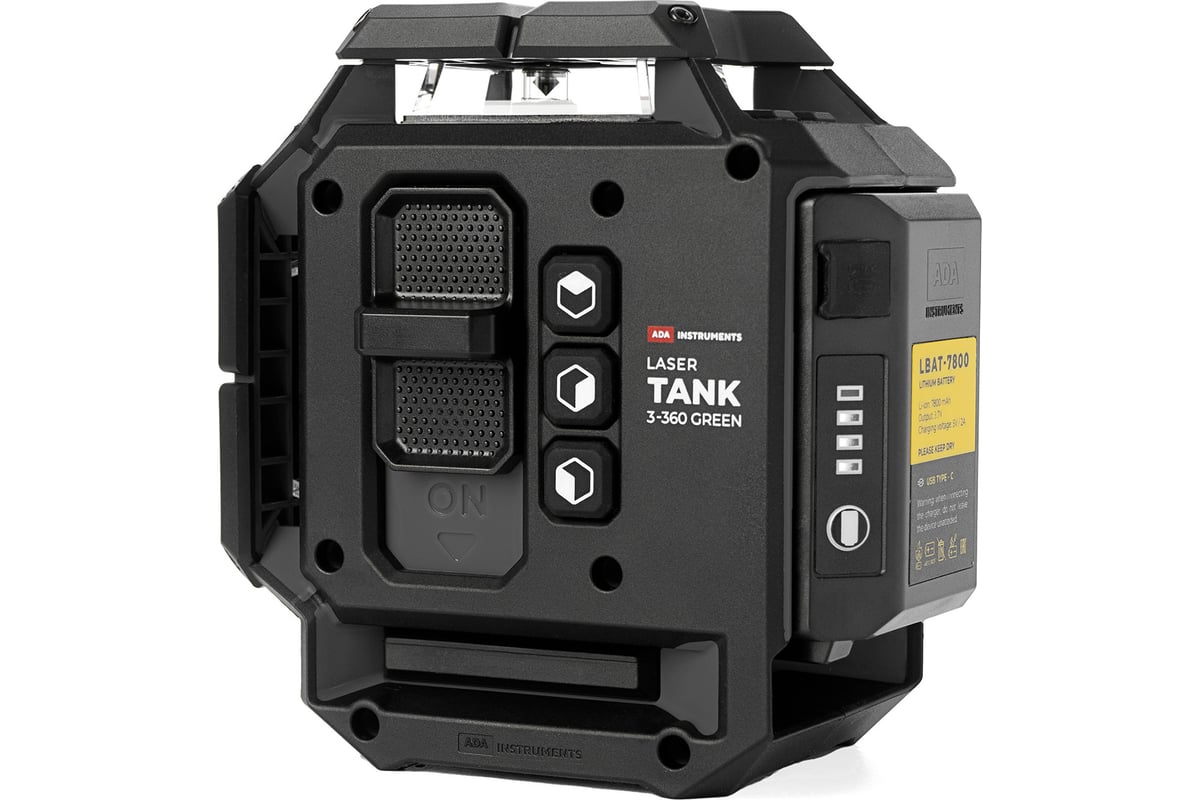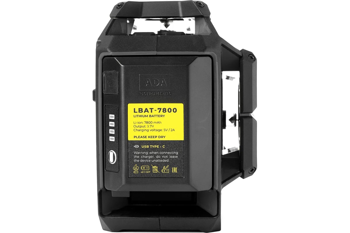 Мощный литиевый аккумулятор. ADA LaserTANK 3-360 GREEN работает от съемного литиевого аккумулятора емкостью 7800 мAч. Большая емкость аккумулятора значительно увеличивает время непрерывной работы по сравнению с обычными лазерными уровнями. Разъем для зарядки аккумулятора - USB Type-C.