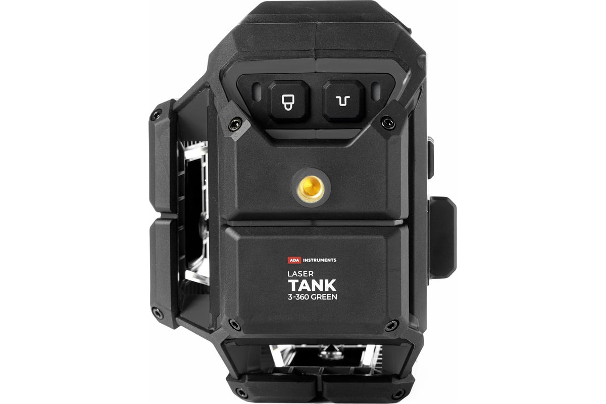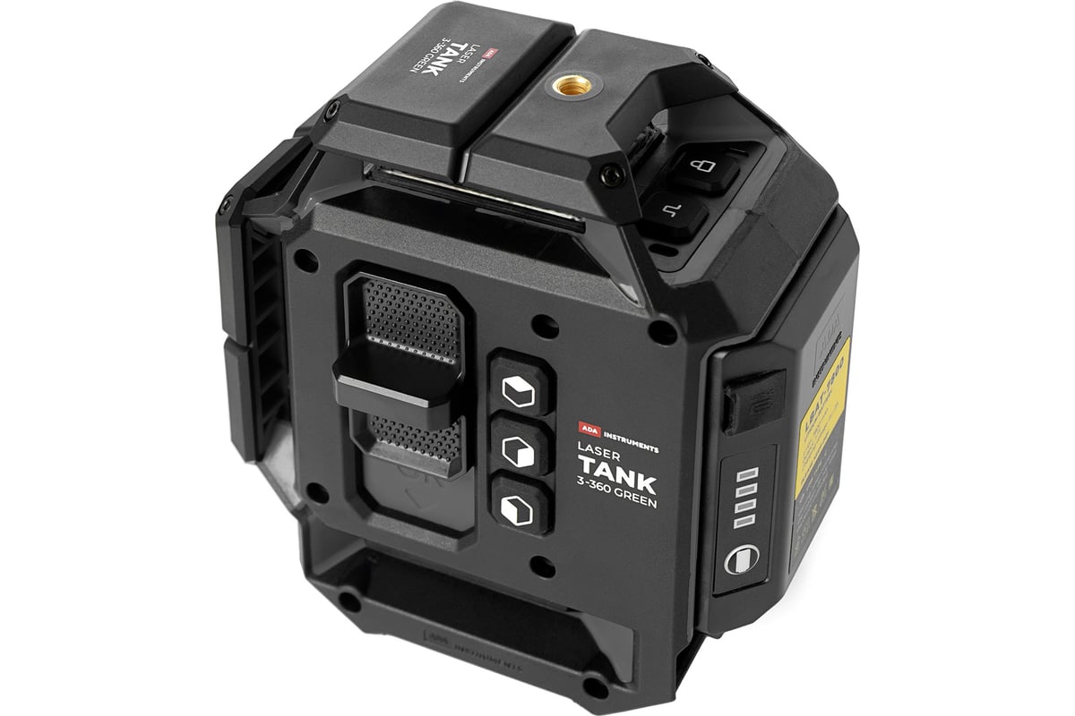 Две точки крепления. ADA LaserTANK 3-360 GREEN можно крепить к штативу или настенному креплению при помощи резьбового соединения 1/4 дюйма. Одна резьба расположена сверху, вторая — снизу. Прибор можно установить на штативе или на универсальном креплении.