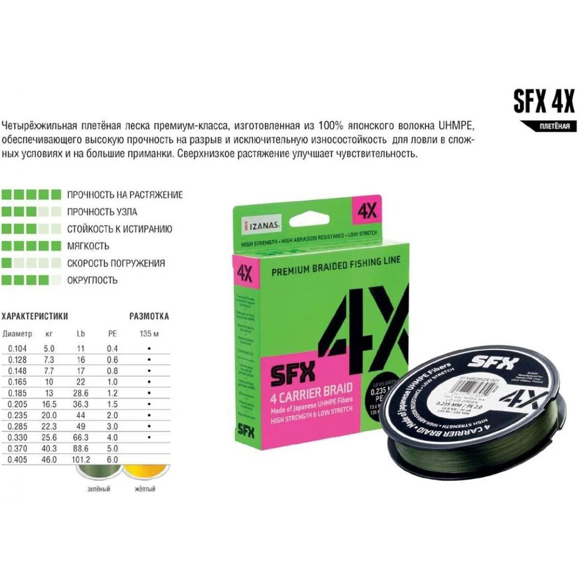 - четырехжильное плетение из 100% японского полиэтиленового волокна;