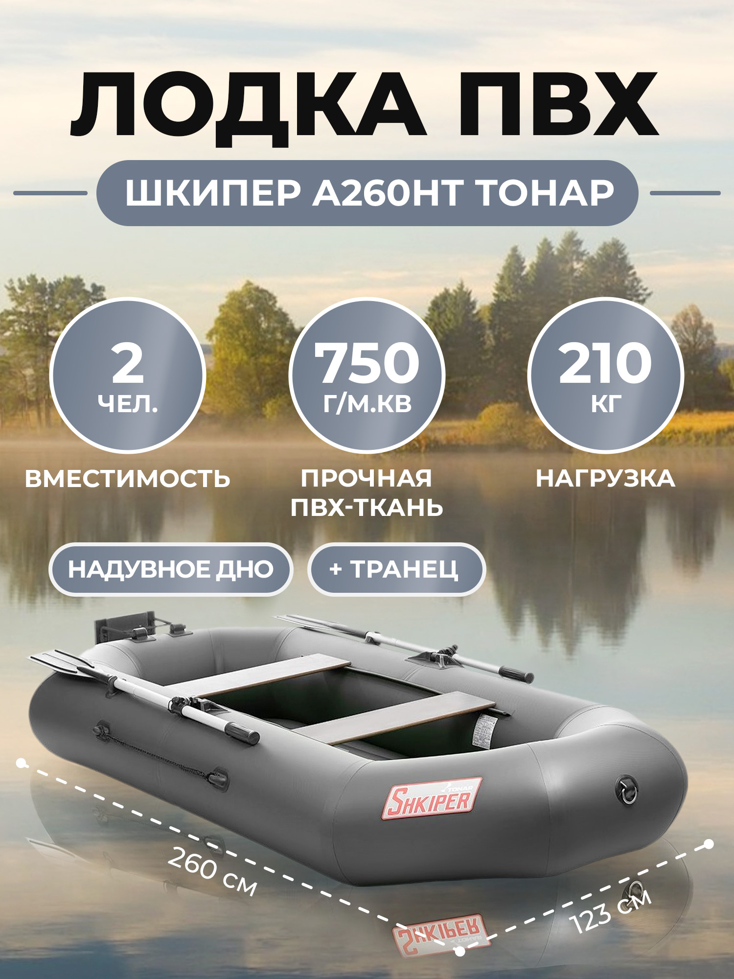 Лодка «ШКИПЕР А260НТ» производства ГК «ТОНАР» создана на базе лодки «ШКИПЕР 260НТ» с навесным транцем и оснащена надувным дном низкого давления. Корпус лодки выполнен из пятислойного армированного ПВХ (750г/м.кв).