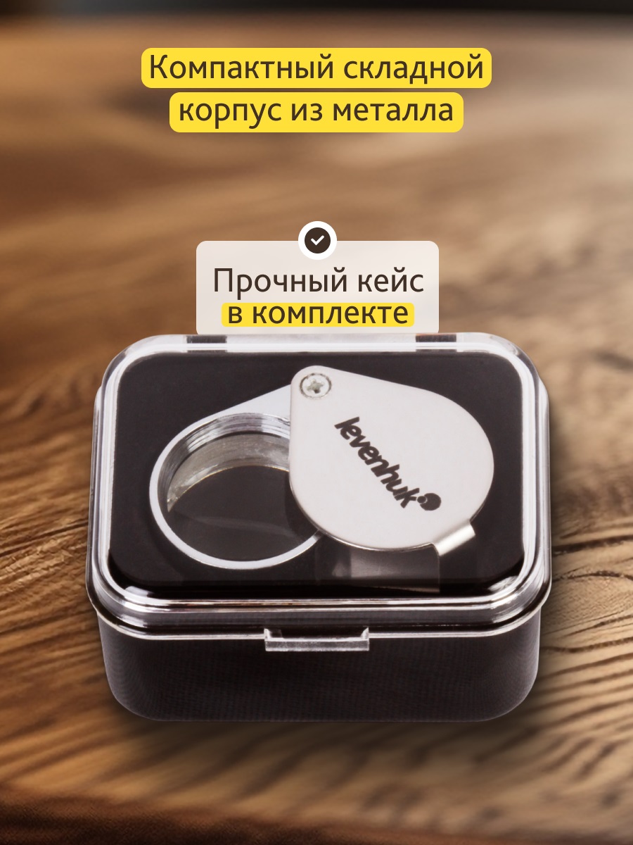В лупе установлена линза из стекла, которая надежно защищена металлической оправой. Благодаря складному корпусу лупу удобно носить с собой – ее практически невозможно повредить, при этом лупа мало весит и занимает совсем немного места в кармане или сумке.