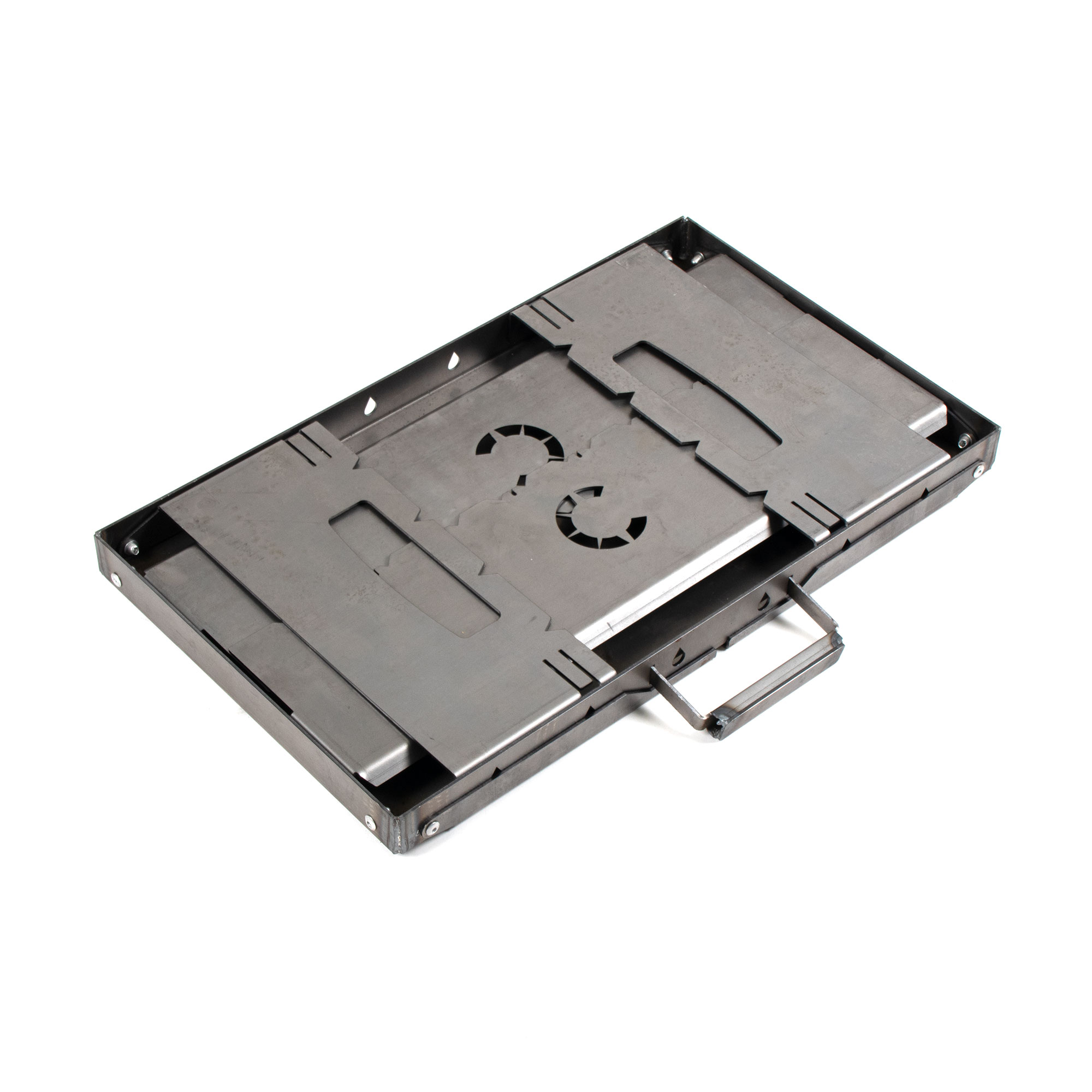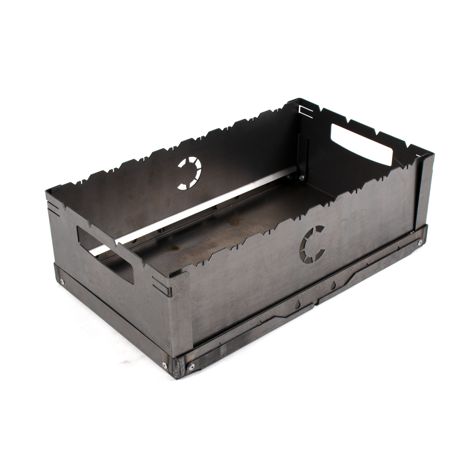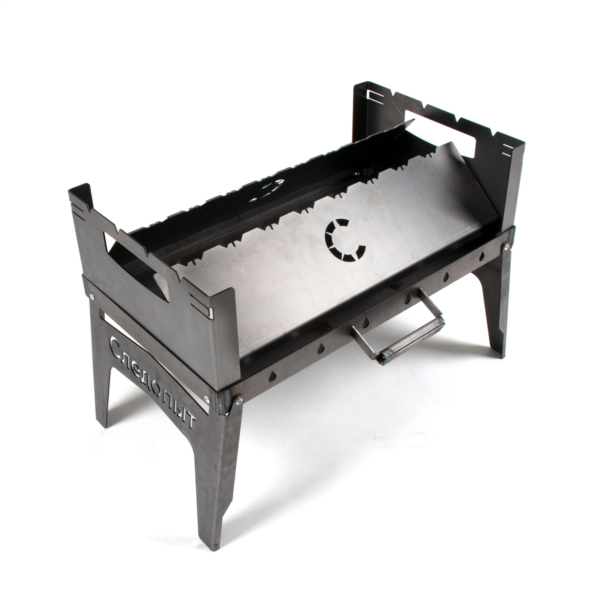 Мангал-дипломат «Следопыт» отличается простотой конструкции и традиционной формой. Изготовлен из стали толщиной 2 мм. За счет толщины металла мангал медленнее остывает, что сказывается на качестве и равномерности прожарки мяса. Характер теплового воздействия на продукт – снизу и сбоку, от стенок. Дополнительное поступление воздуха создается интенсивным обмахиванием остывающих углей. Мангал может быть, как стационарным, так и переносным. Не деформируется от жара даже после многочасового непрерывного горения в нем как дров, так и древесного угля. Простота конструкции позволяет осуществлять быструю сборку и разборку изделия.