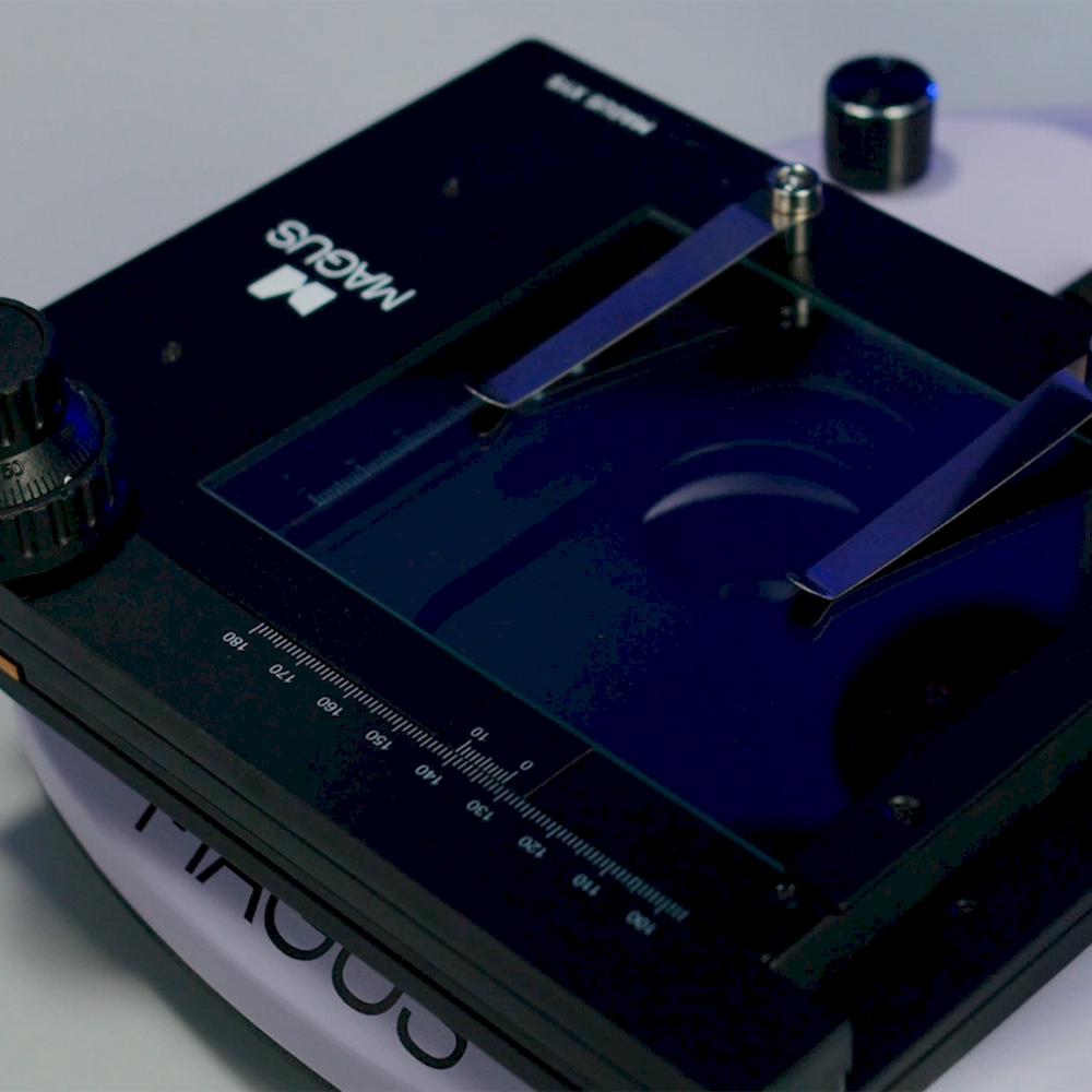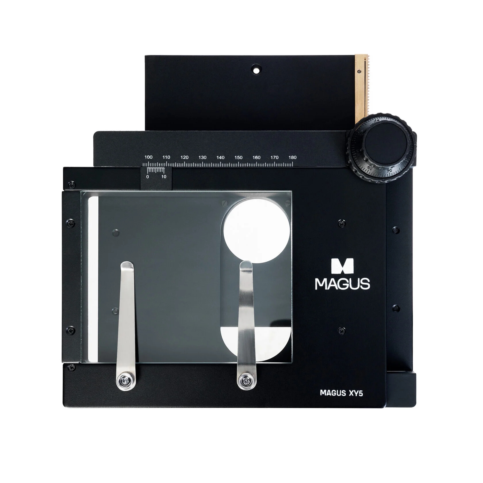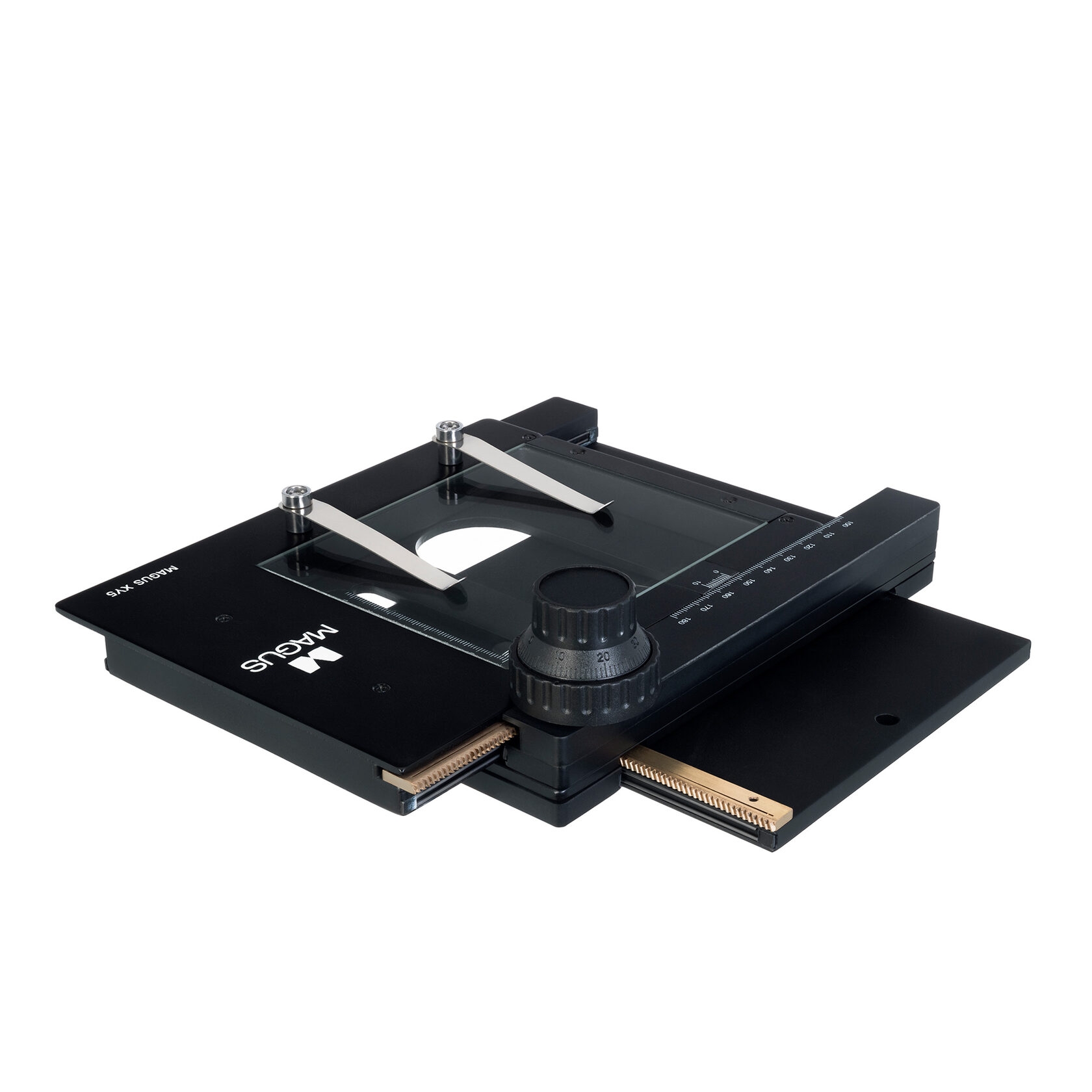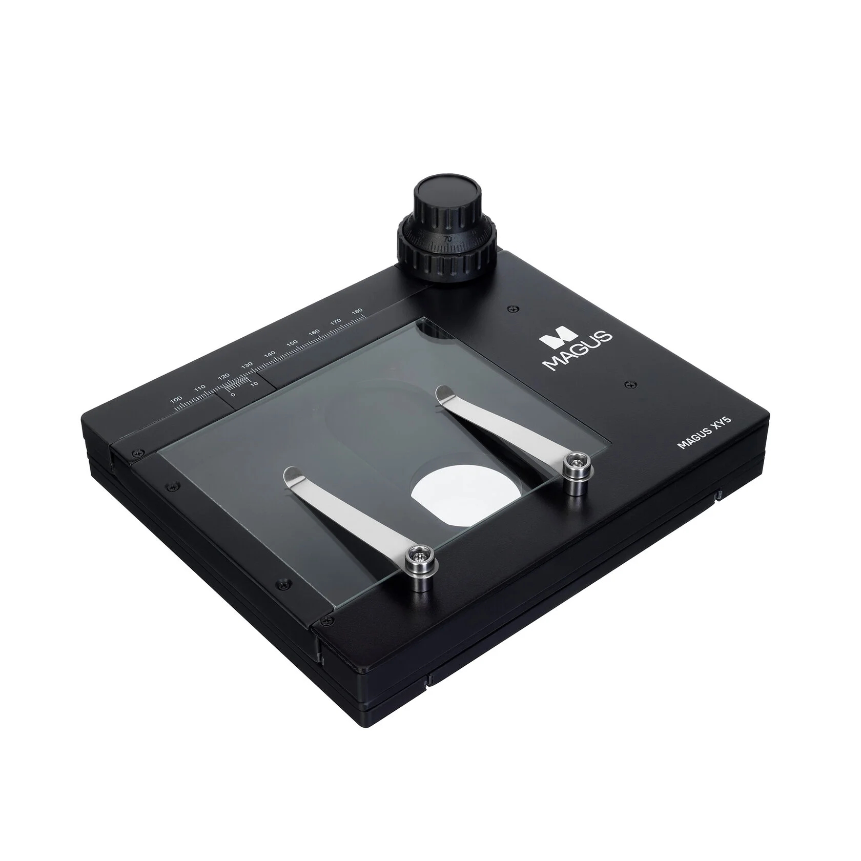 Стеклянная прозрачная поверхность столика позволяет работать в отраженном и проходящем свете. Измерительная шкала с нониусом для измерения по одной оси. Для фиксации плоских объектов на столике два прижима.