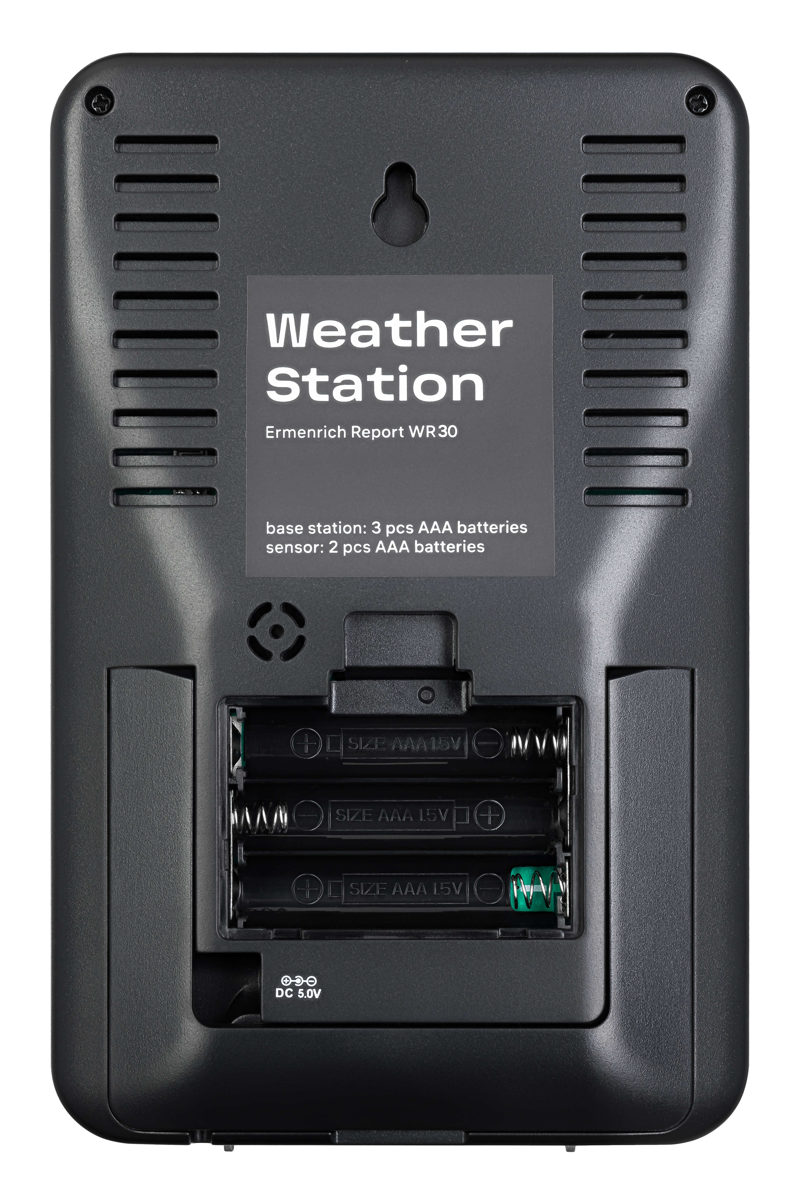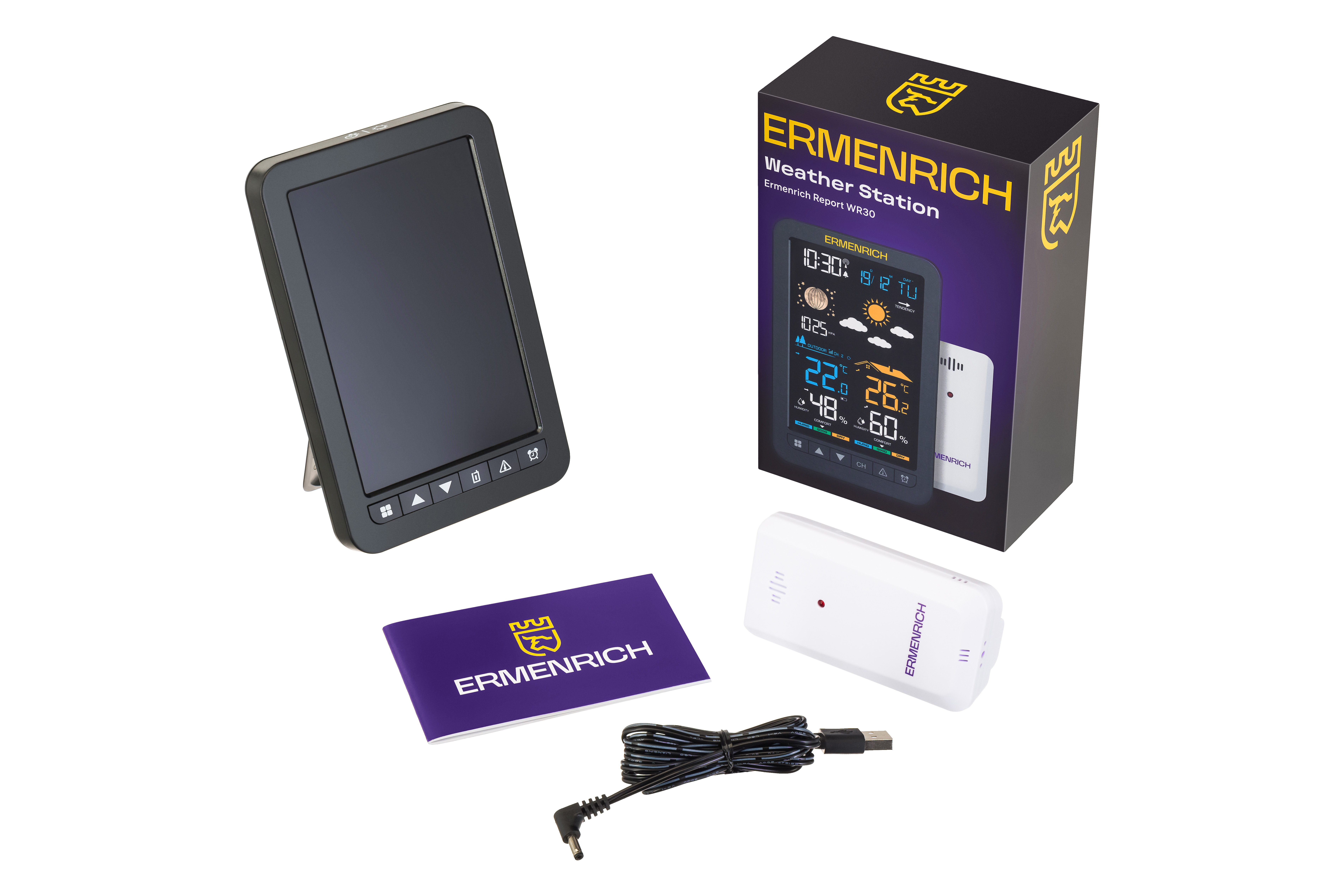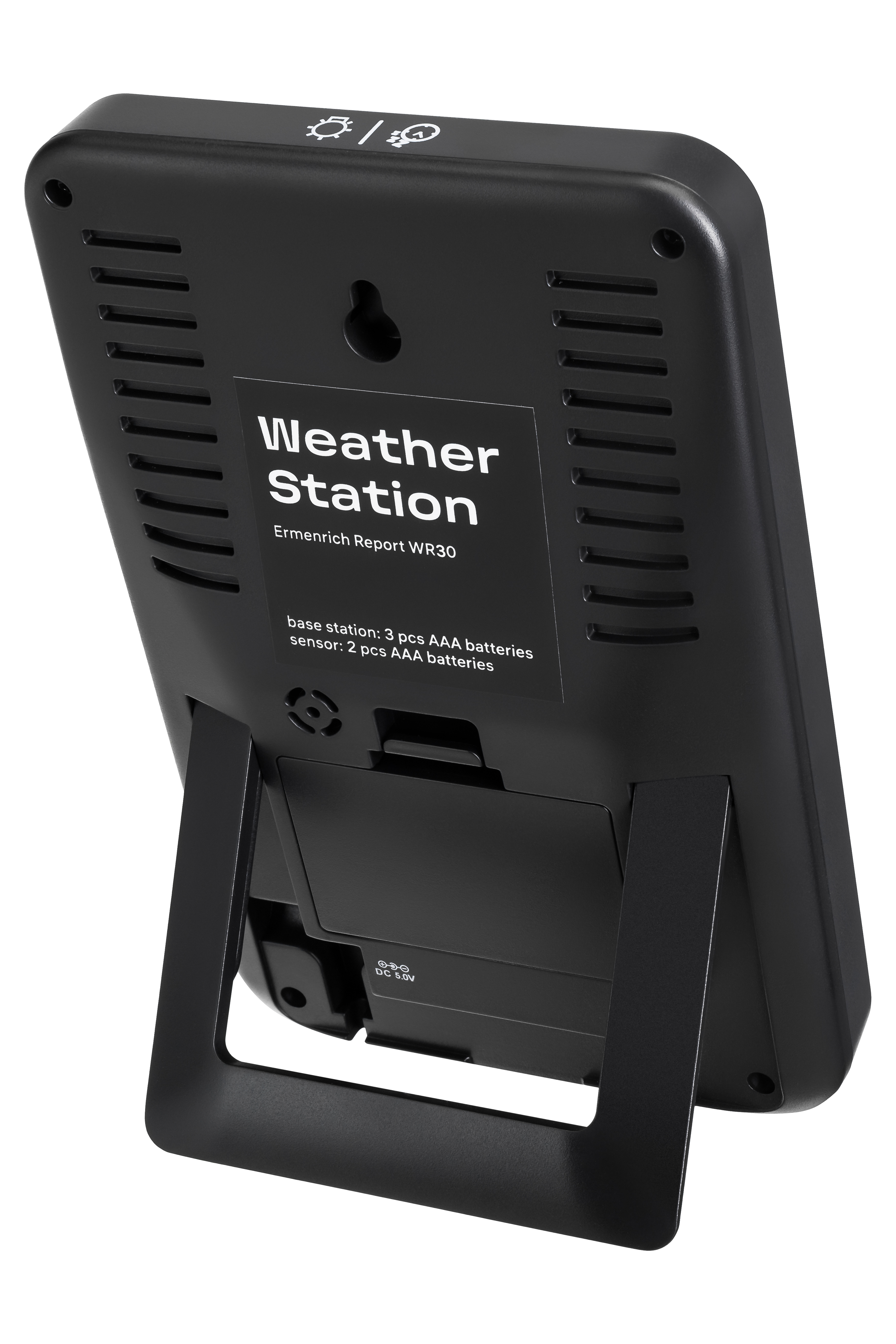 Метеостанция Ermenrich Report WR30 – домашний прибор для контроля наиболее важных в повседневной жизни атмосферных показателей: температуры, влажности воздуха, атмосферного давления. Он имеет широкие диапазоны измерения, высокую точность работы и подходит для использования во всех регионах – от холодных и влажных до жарких и сухих. Благодаря наличию встроенных часов, будильника и календаря метеостанция может заменить собой стандартные цифровые часы, которые можно разместить на любой удобной поверхности – столе или стене.