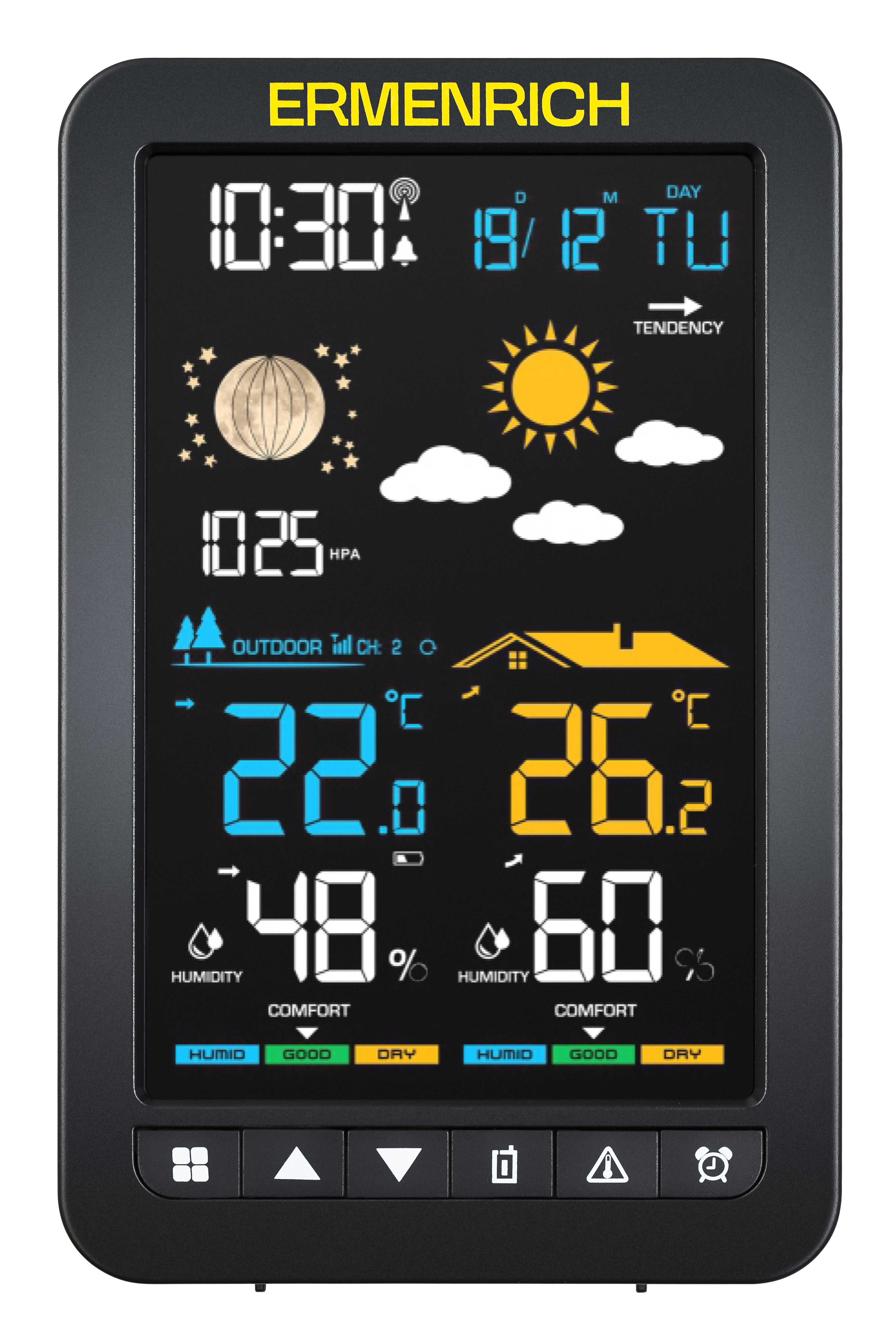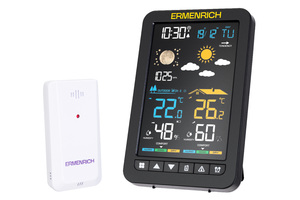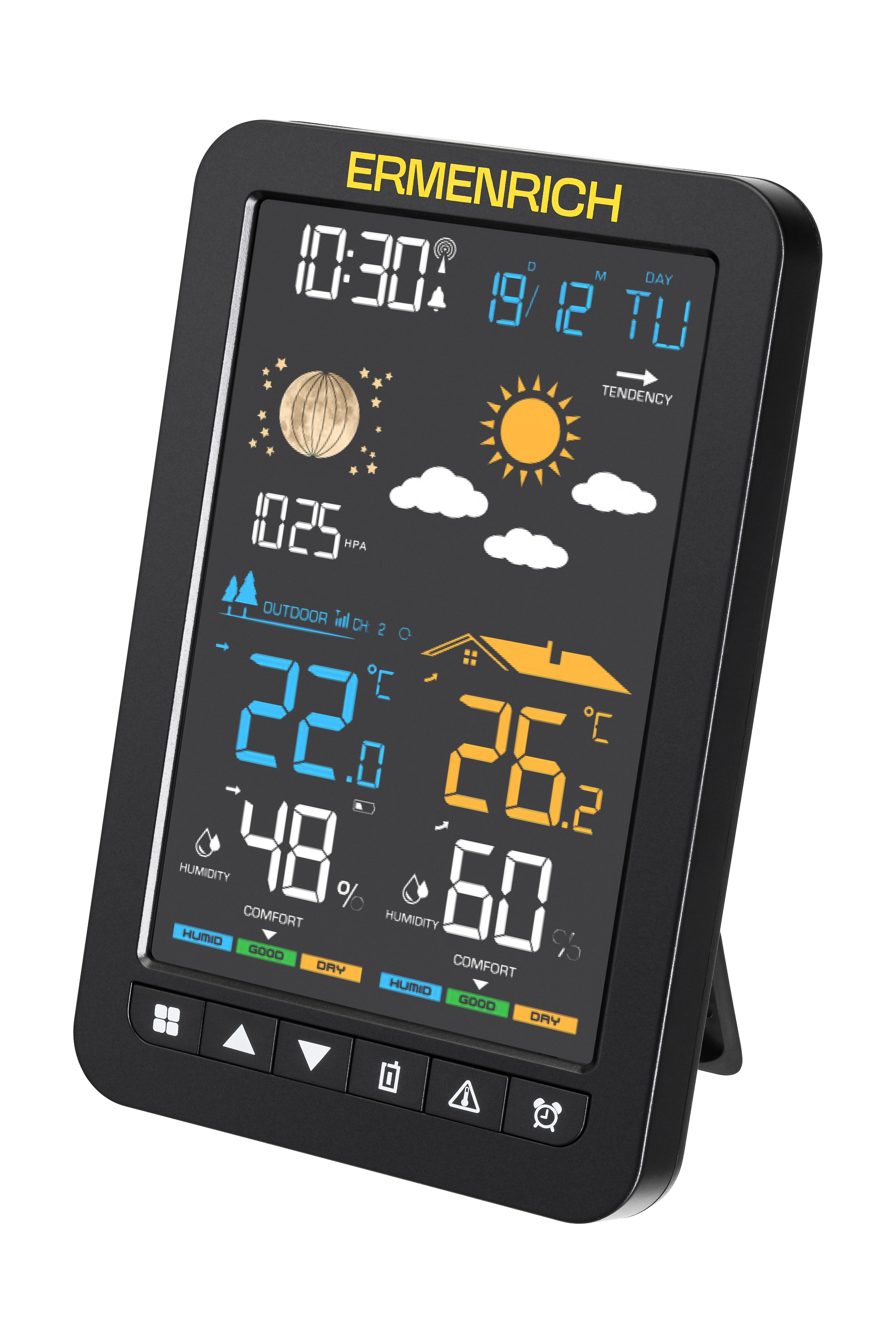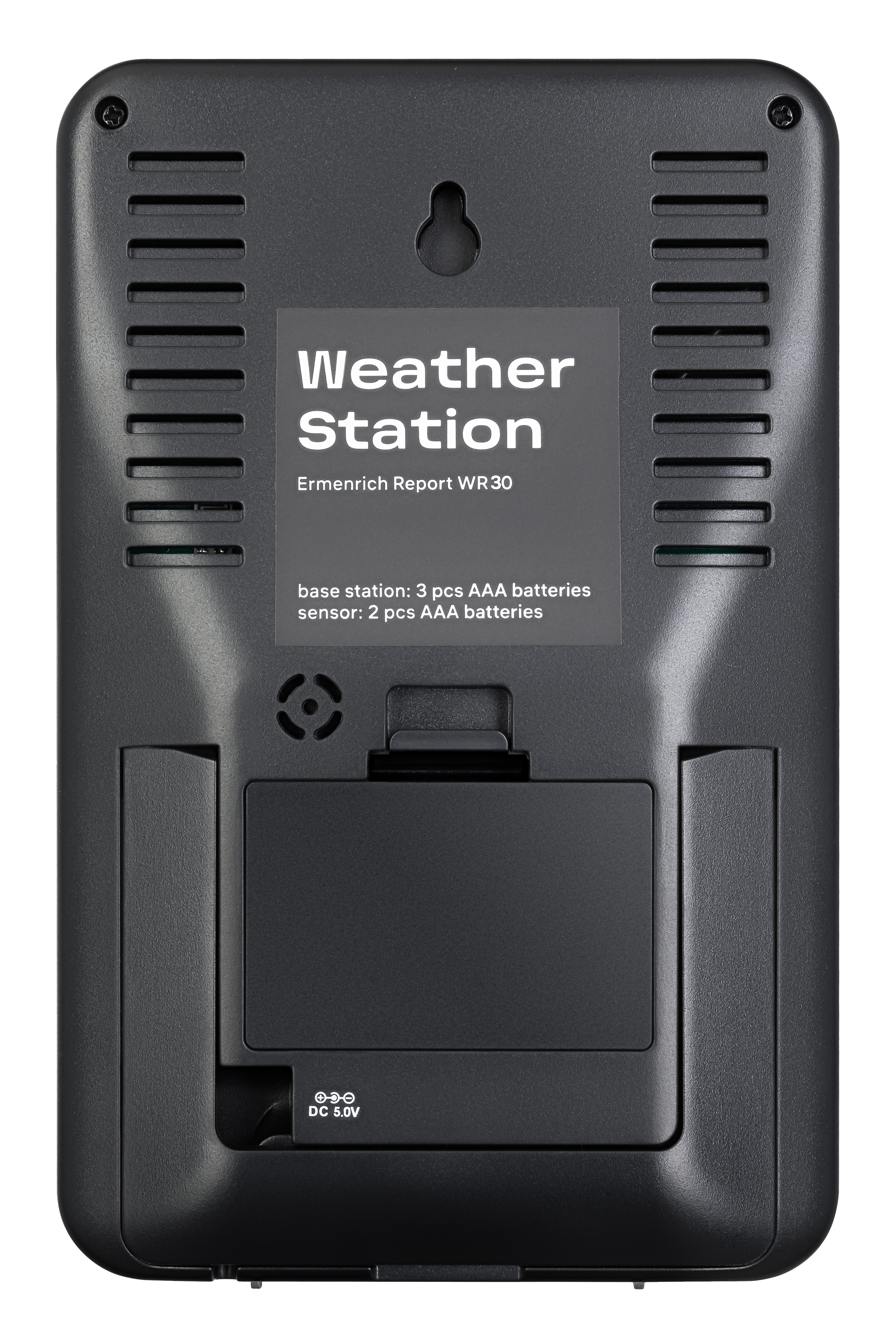 Метеостанция Ermenrich Report WR30 – домашний прибор для контроля наиболее важных в повседневной жизни атмосферных показателей: температуры, влажности воздуха, атмосферного давления. Он имеет широкие диапазоны измерения, высокую точность работы и подходит для использования во всех регионах – от холодных и влажных до жарких и сухих. Благодаря наличию встроенных часов, будильника и календаря метеостанция может заменить собой стандартные цифровые часы, которые можно разместить на любой удобной поверхности – столе или стене.