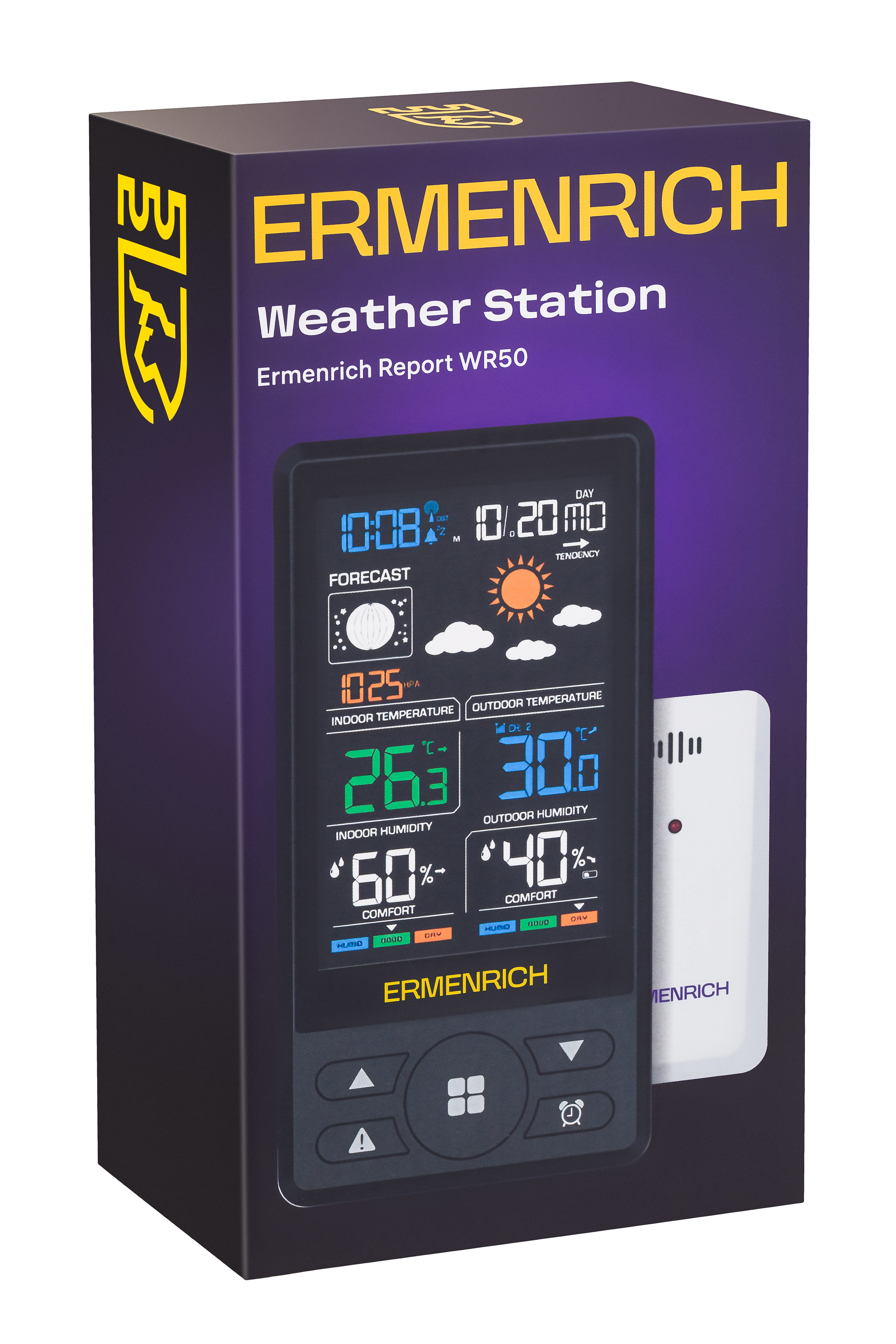 Метеостанция Ermenrich Report WR50 – компактное устройство в стильном дизайне, которое используется в домашних условиях для оценки микроклимата в помещении и изучения погоды на улице. Оно комплектуется беспроводным внешним датчиком, который можно закрепить на стене, дереве или заборе на расстоянии до 80 метров от основного модуля.