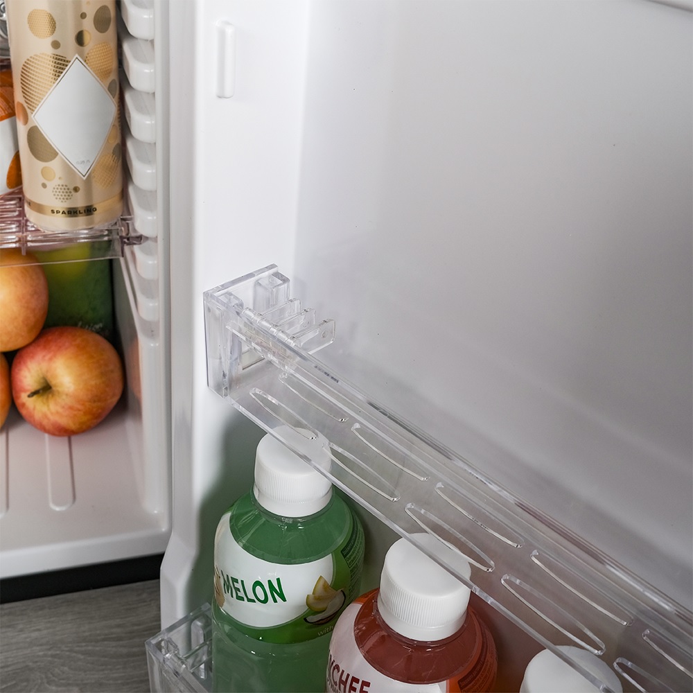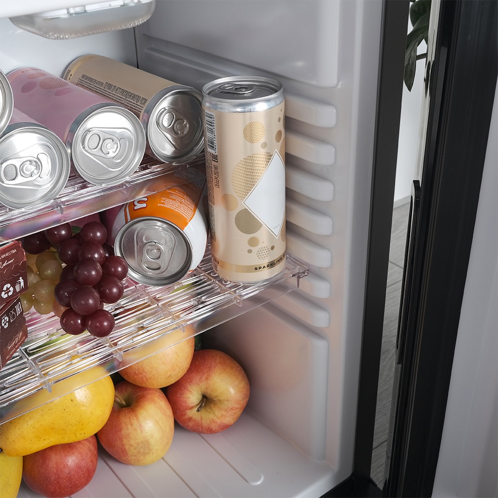 При установке мини-бара с каждой стороны должен быть зазор не менее 50 мм. Внутреннее пространство организовано с учетом различных потребностей. На двух основных полках размещаются бутылки и продукты, а дополнительные закуски — в двух дверных секциях (все полки регулируются по высоте). Благодаря внутреннему освещению содержимое хорошо видно даже в темное время суток.