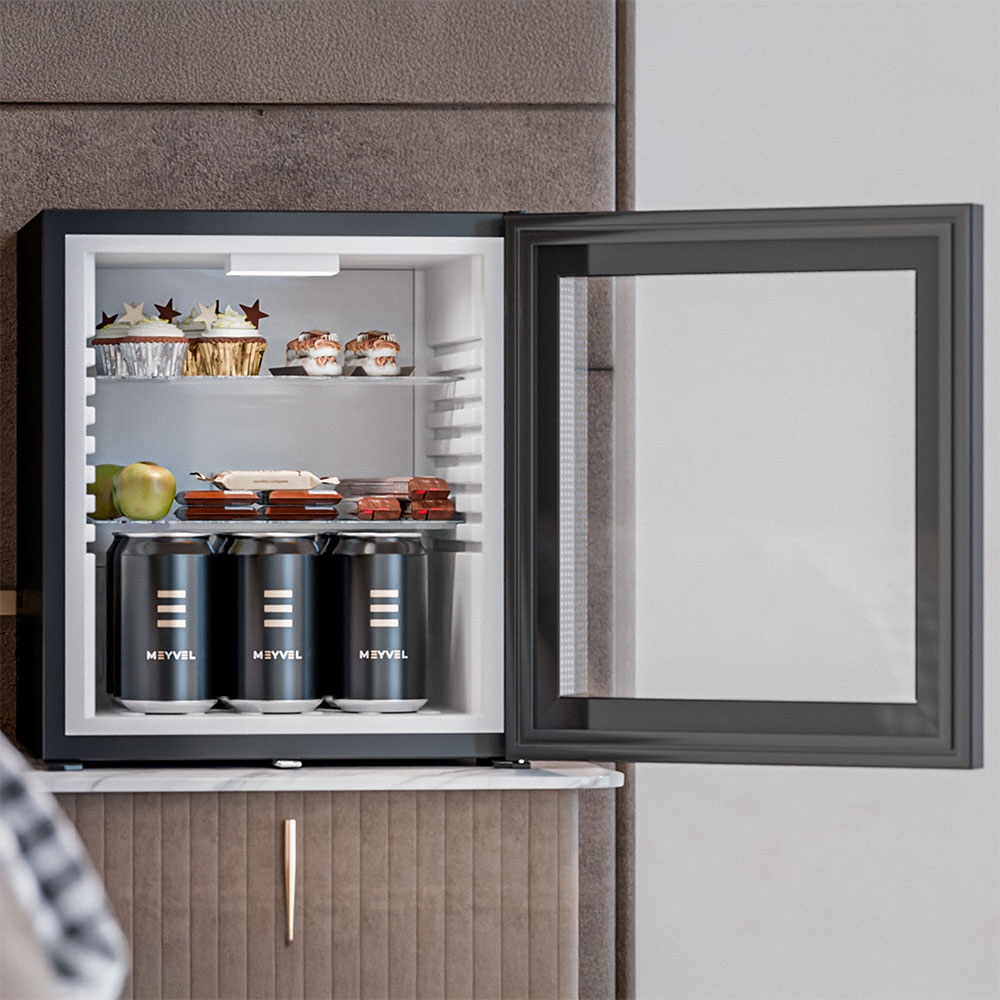 Дверца Meyvel MMT-30BG реверсивная, поэтому устройство адаптируется к конкретным условиям установки, и стеклянная, чтобы видеть содержимое без необходимости открывать мини-бар. Это удобно для гостей отеля или сотрудников офиса. Автоматическая разморозка делает эксплуатацию прибора максимально простой — не нужно вручную удалять наледь, устройство само поддерживает оптимальный режим работы.