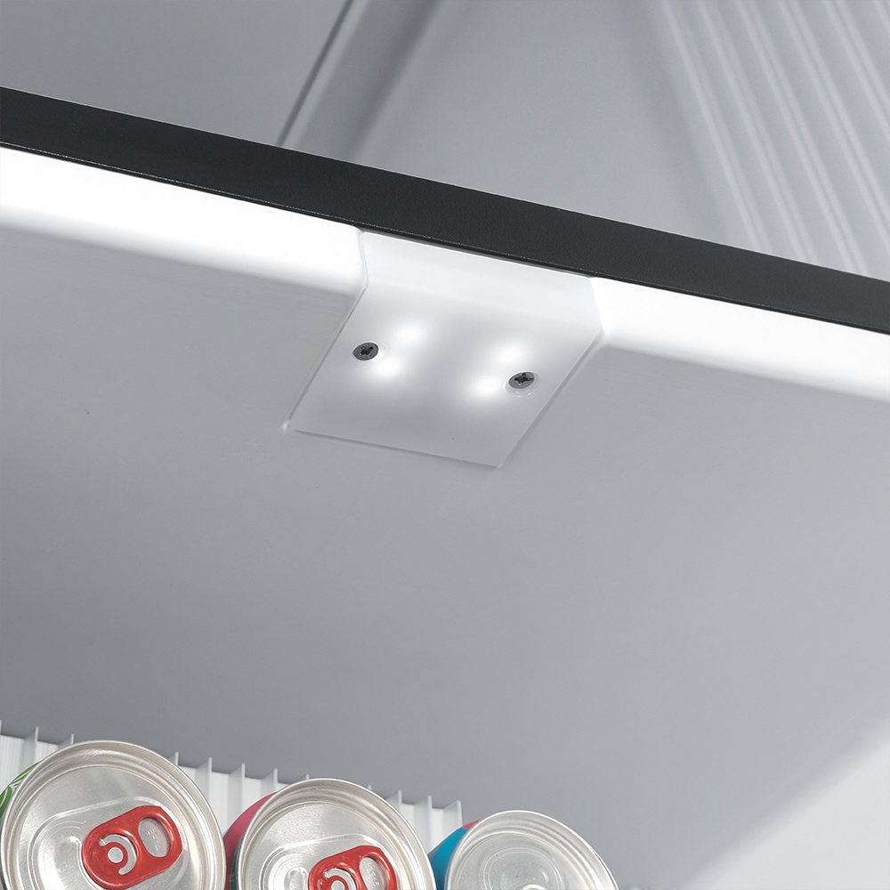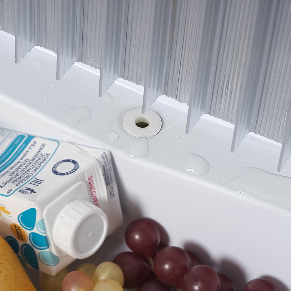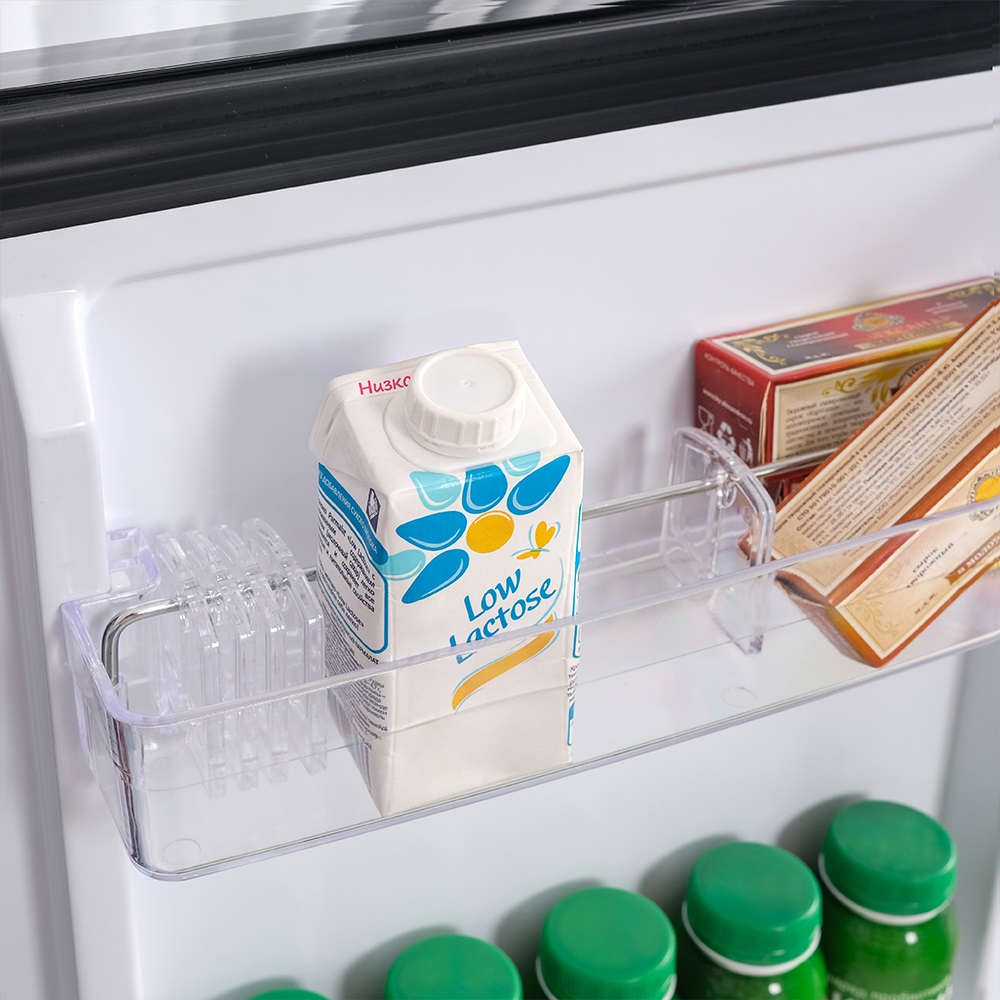Внутреннее пространство продумано до мелочей. Две полки регулируется по высоте под размер бутылок, упаковок и других продуктов, а две дверные секции также легко настраиваются, чтобы компактно разместить дополнительные запасы. Встроенная подсветка делает использование удобным даже в полной темноте, помогая быстро найти нужный напиток.