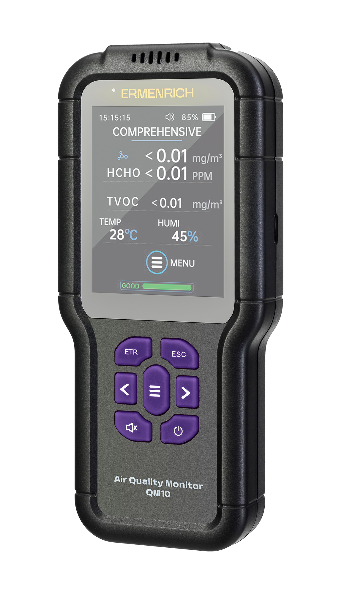 Монитор качества воздуха Ermenrich QM10 предназначен для оперативного анализа воздуха на предмет загрязнения в жилых и коммерческих помещениях – квартирах, офисах, школах, гостиницах, кафе и магазинах. Прибор обнаруживает более 23 видов опасных летучих соединений, включая бензолы, алканы, ароматические углеводороды, олефины, галогенированные углеводороды, сложные эфиры, альдегиды, кетоны и др. Он оснащен многоуровневой сигнализацией, помогающей быстро реагировать на измеренные показатели, когда те требуют срочного внимания. При превышении допустимых концентраций формальдегида (HCHO) или общего уровня летучих органических соединений (TVOC) монитор подает звуковой сигнал (зуммер) и световое предупреждение. Звук тревоги при необходимости можно отключить – это опция остается на усмотрение пользователя.