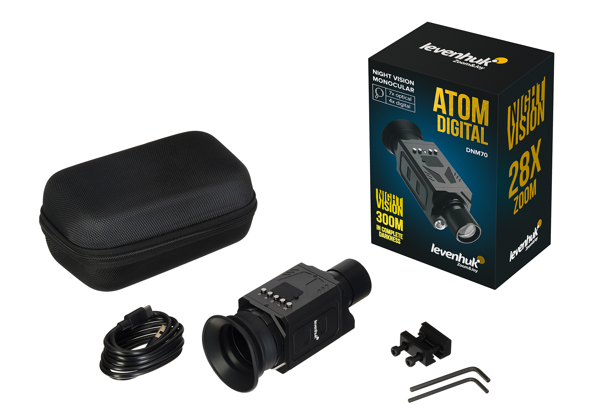 Монокуляр Levenhuk Atom Digital DNM70 – это надежный прибор ночного видения, который предназначен для наблюдения в условиях недостаточной освещенности. Благодаря 7-кратному оптическому увеличению и дополнительному цифровому зуму 1/2/3/4x вы сможете детально рассмотреть объекты на расстоянии до 300 метров ночью и без ограничений днем. Современное оптическое стекло обеспечивает яркое и четкое изображение. Широкое угловое поле зрения 20° и минимальная дистанция фокусировки в 5 метров позволяют быстро находить и удерживать цель – в лесу, на открытой местности или в городской среде.